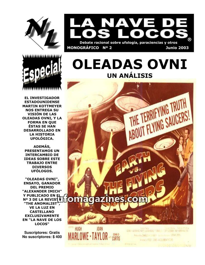 This issue of 'La Nave de los Locos' features an analysis of UFO waves by Martin Kottmeyer, examining various theories from extraterrestrial hypotheses to socio-psychological expla