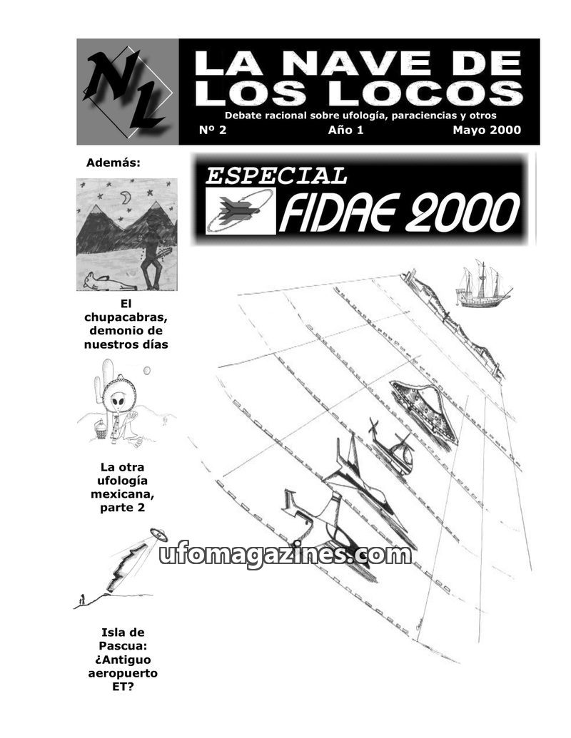 This issue of 'La Nave de los Locos' covers the FIDAE 2000 ufology seminar in Chile, highlighting presentations by international investigators like Richard Haines, Antonio Huneeus,