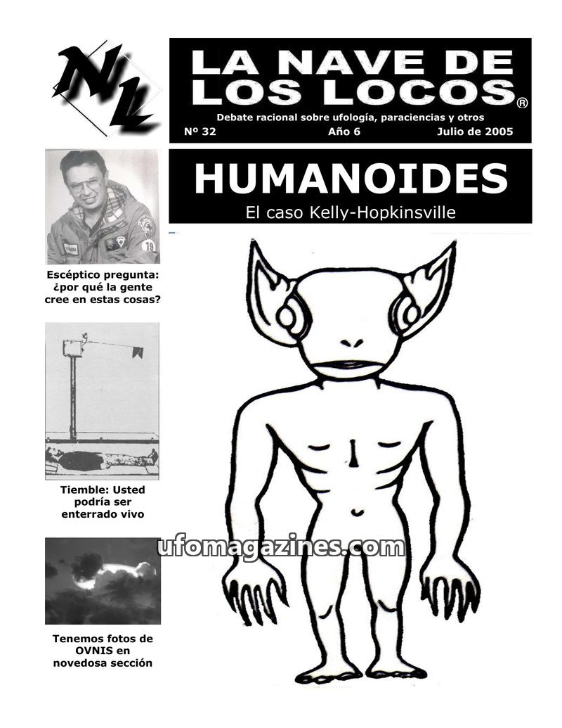 This issue of 'La Nave de los Locos' focuses on the Kelly-Hopkinsville humanoid case, presenting the theory that the entities were actually owls. It details the events of August 21