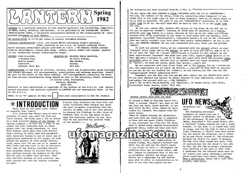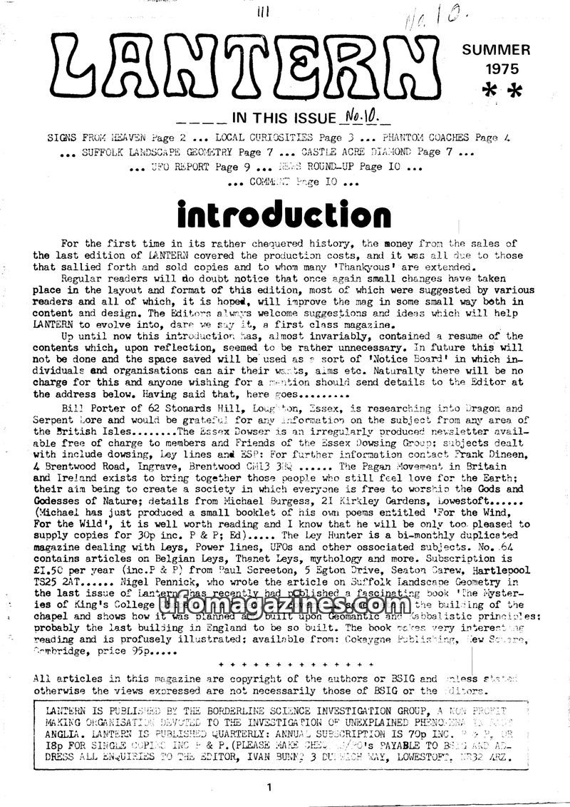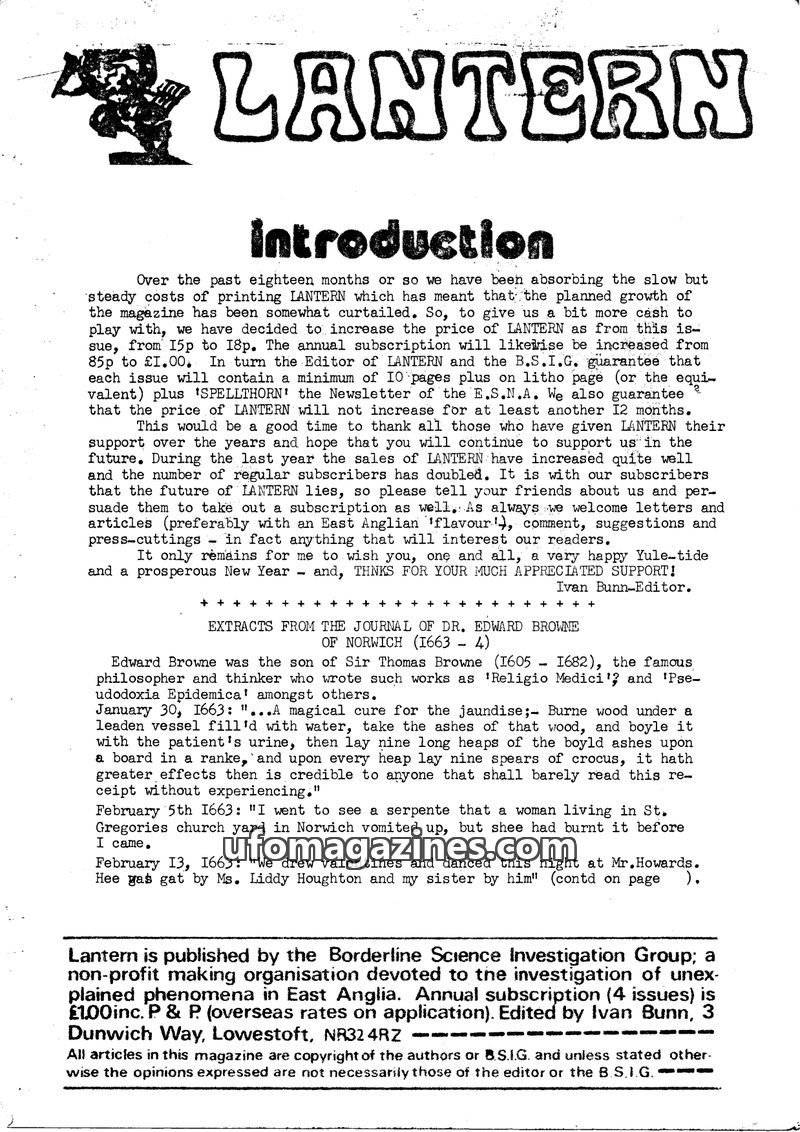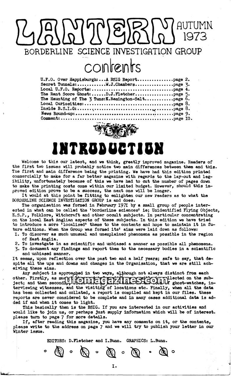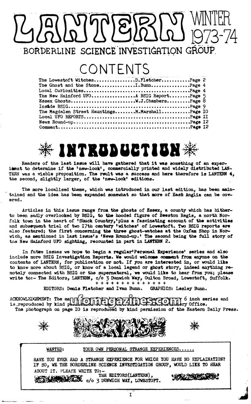 This issue of Lantern magazine, published by the Borderline Science Investigation Group (BSIG) in Autumn 1973, focuses on local paranormal phenomena in East Anglia. It includes a d