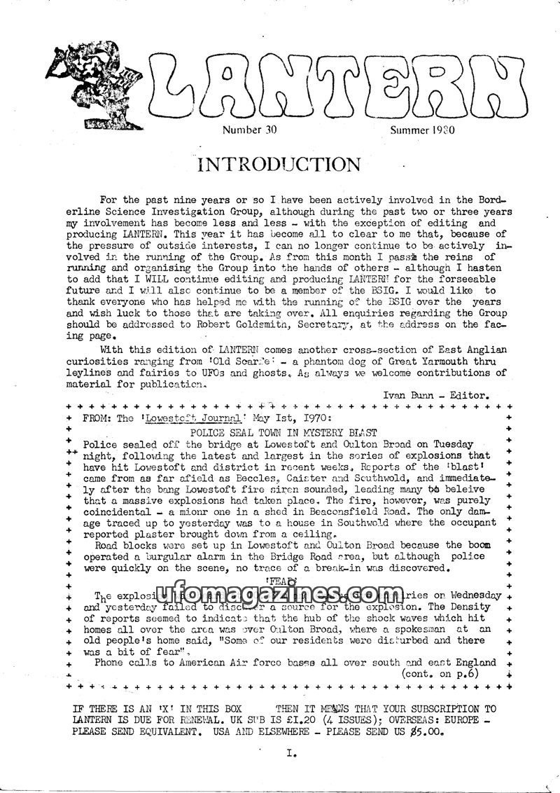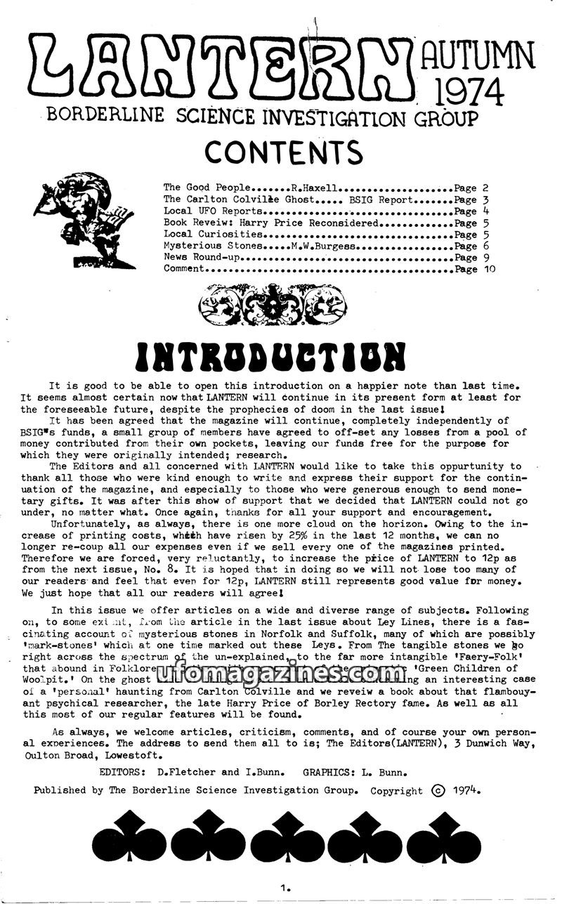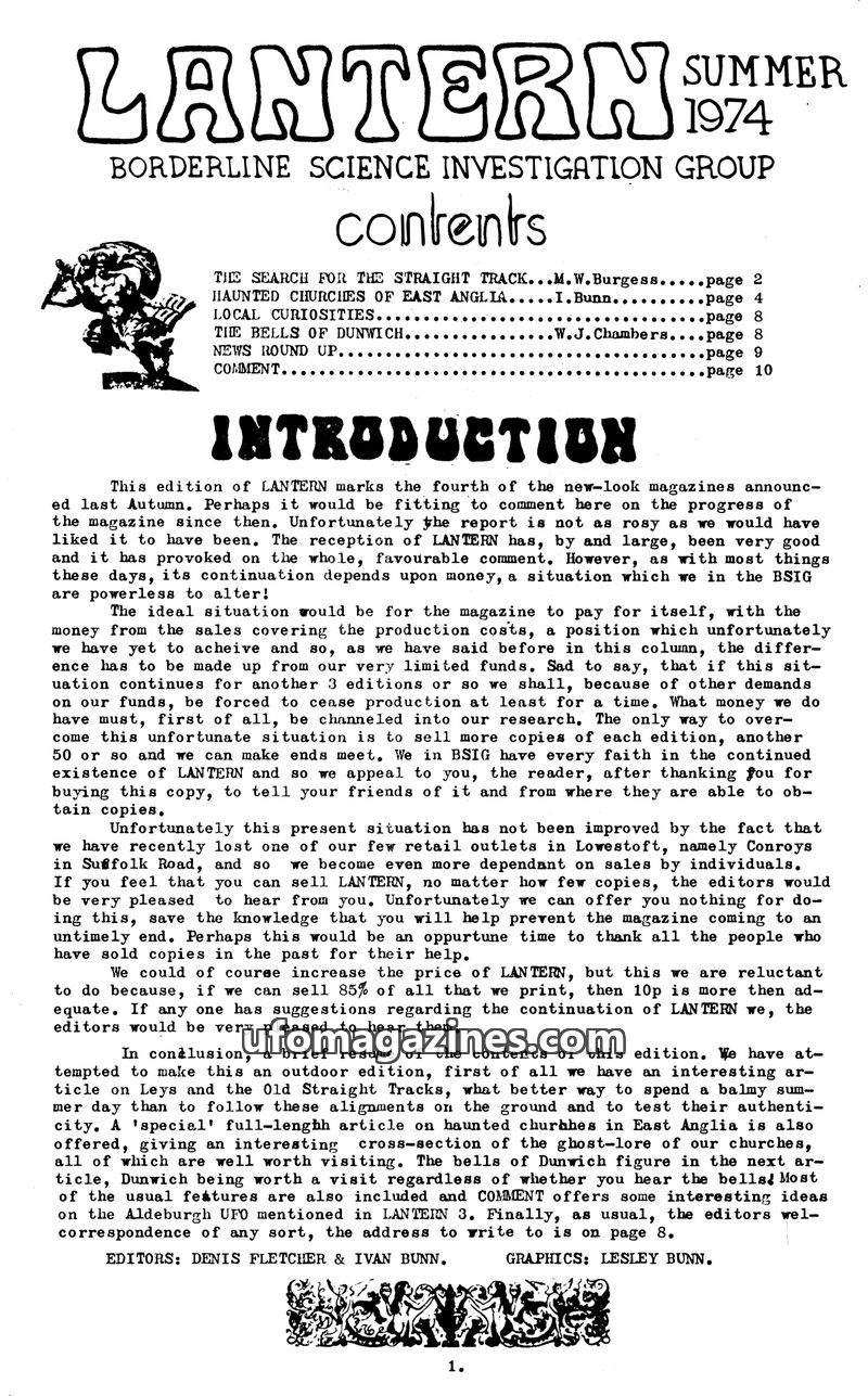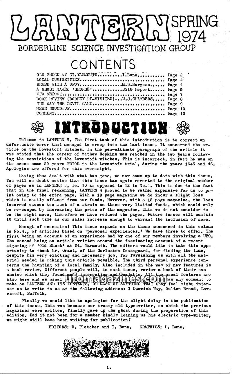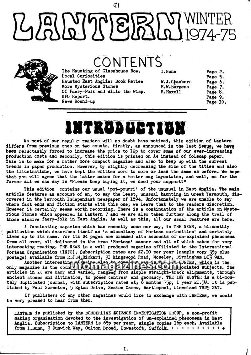 This issue of Lantern magazine, published by the Borderline Science Investigation Group (BSIG) in Autumn 1973, focuses on local paranormal phenomena in East Anglia. It includes a d