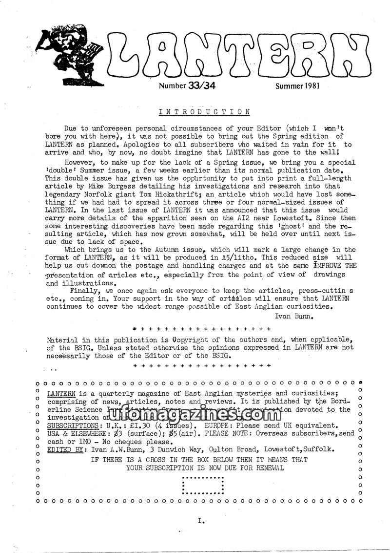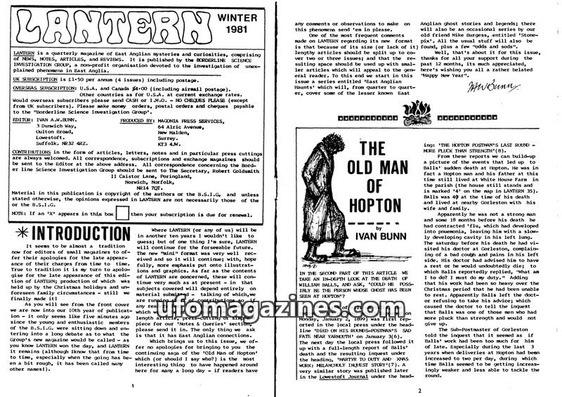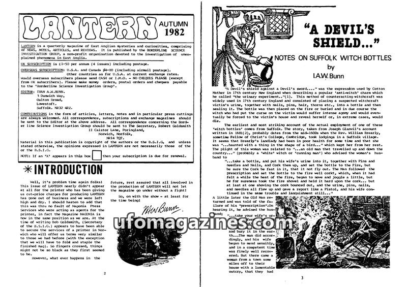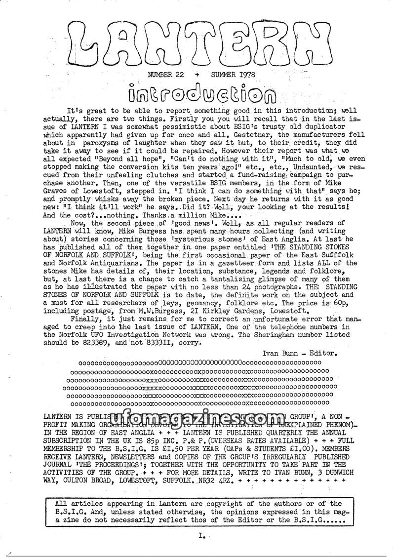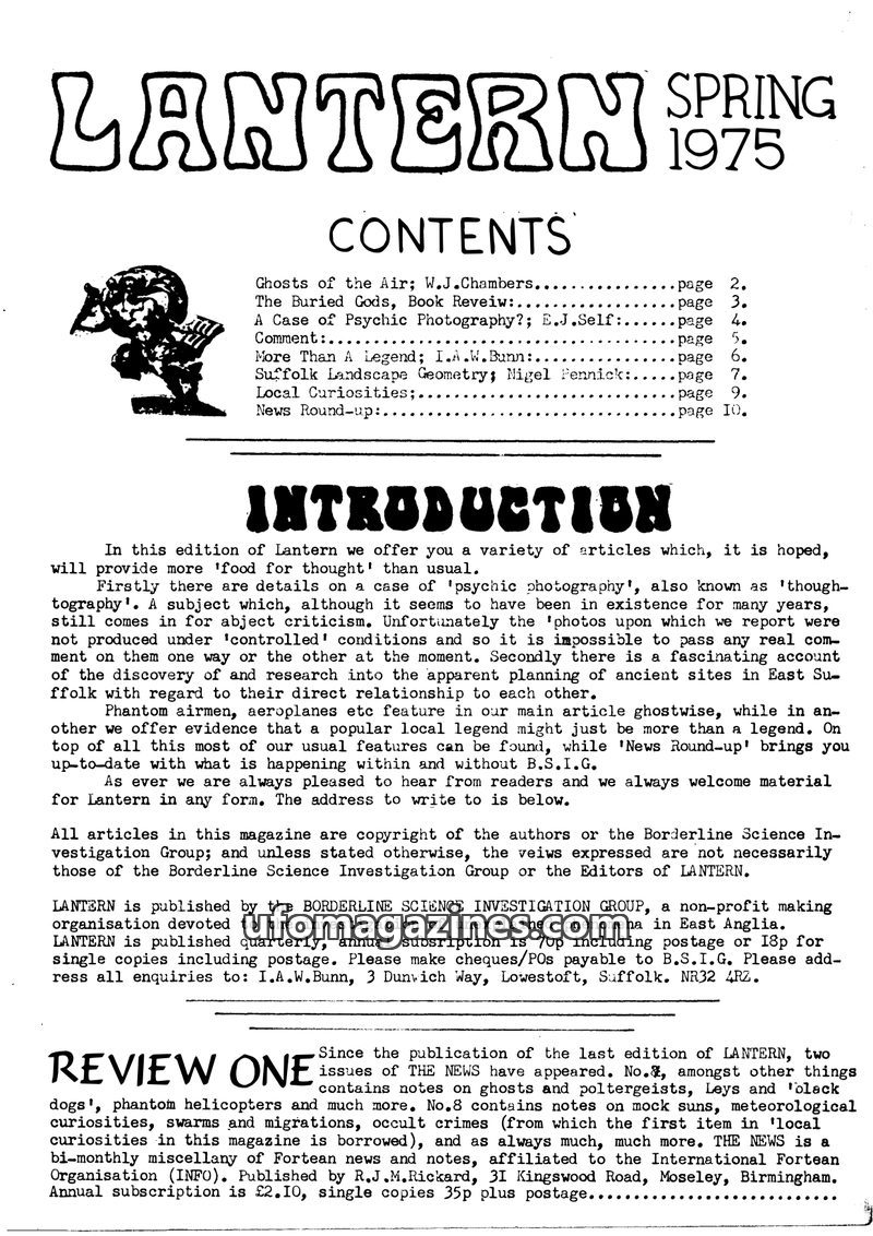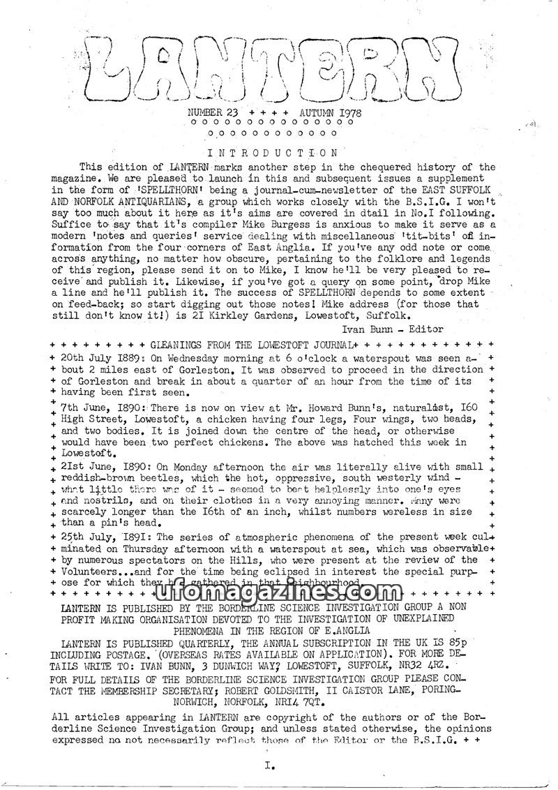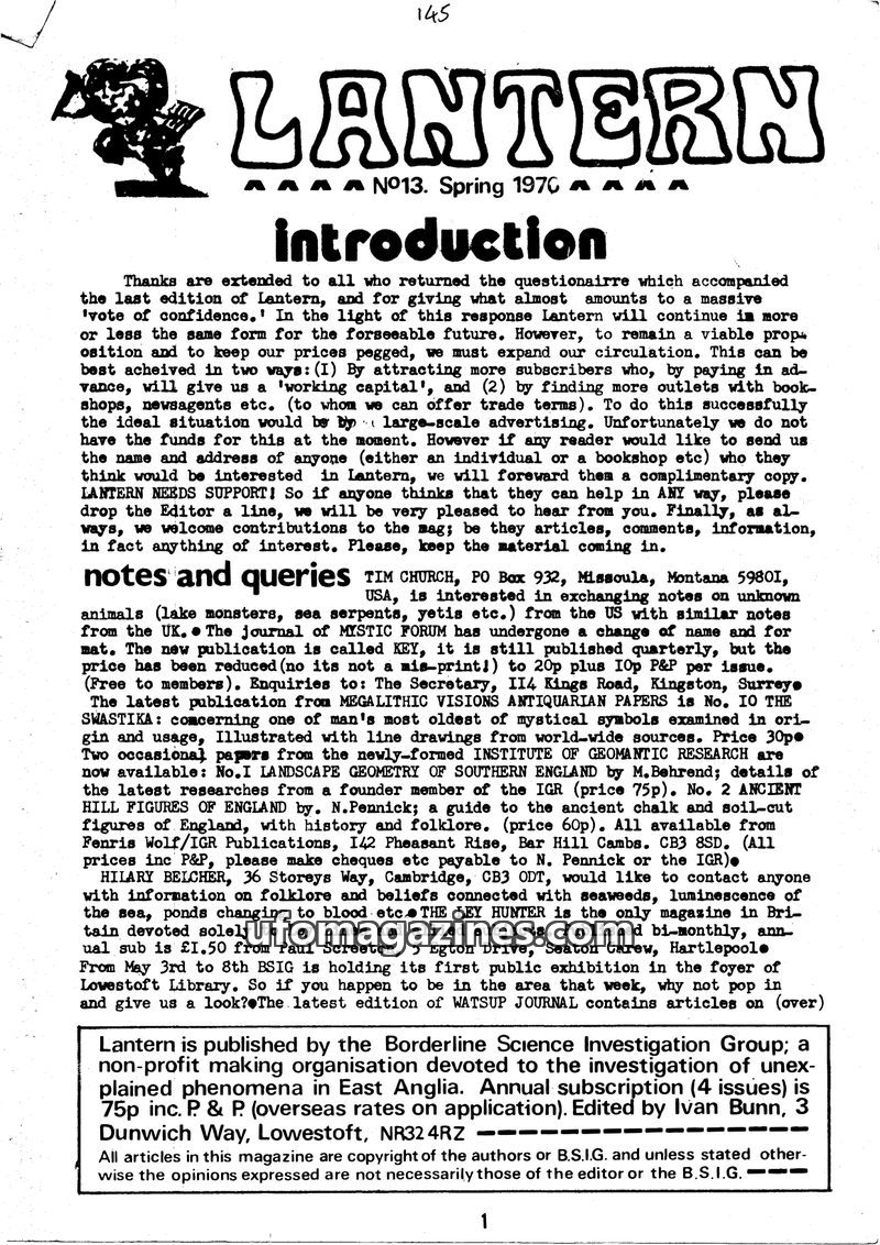 This issue of Lantern magazine, published by the Borderline Science Investigation Group (BSIG), features articles on mysterious stones in East Anglia, local curiosities, a detailed