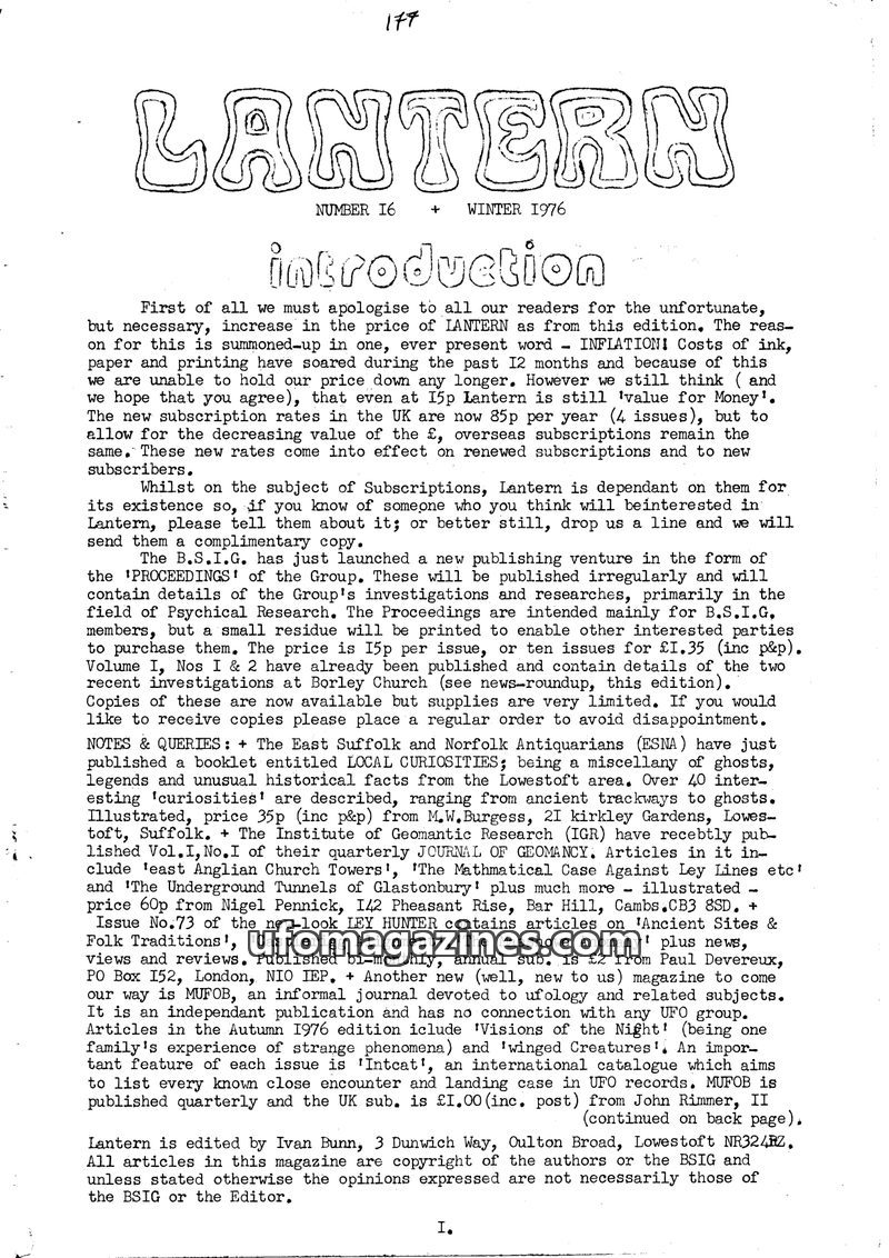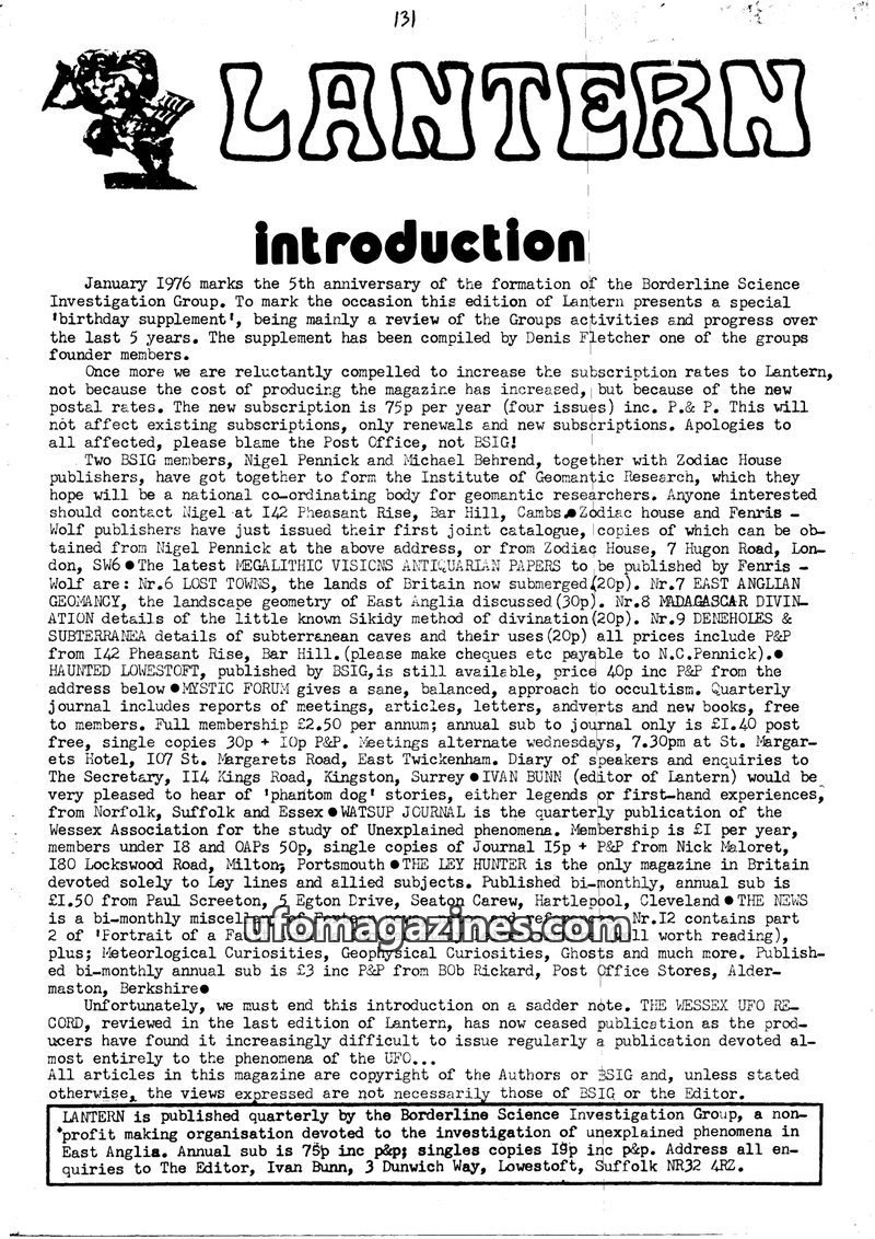 This January 1976 issue of Lantern marks the 5th anniversary of the Borderline Science Investigation Group with a special supplement. Subscription rates are increasing due to posta