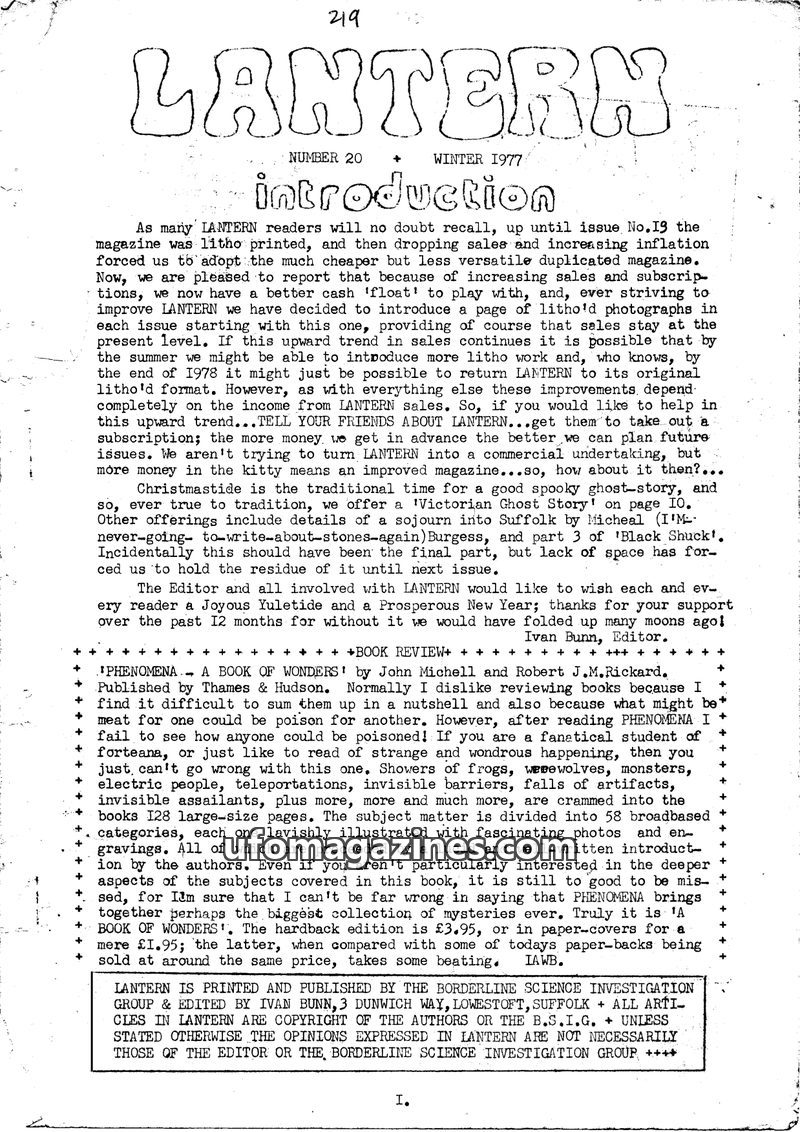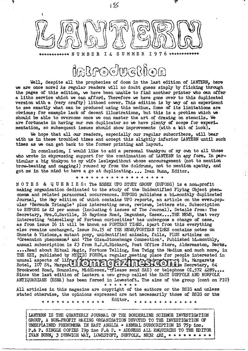 This issue of LANTERN, the quarterly journal of the Borderline Science Investigation Group (BSIG), is presented in a duplicated format due to affordability issues. The editor, Ivan