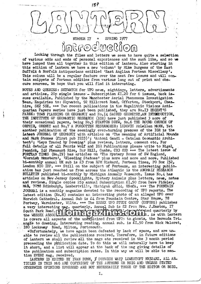 This issue of Lantern magazine, dated Spring 1977, covers a wide range of Fortean topics including UFO sightings, terrestrial zodiacs, and local hauntings. It announces the formati