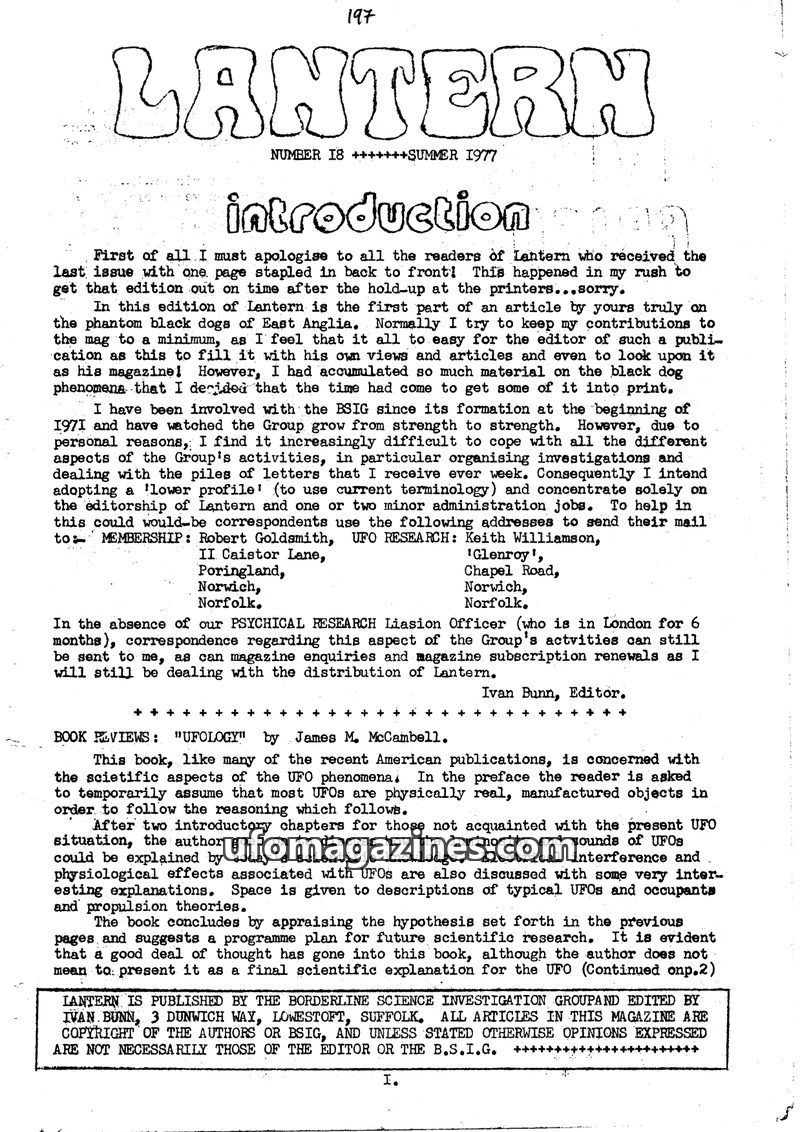 The Summer 1977 issue of LANTERN magazine, published by the Borderline Science Investigation Group, features an editorial apology for a previous issue's error and an introduction t