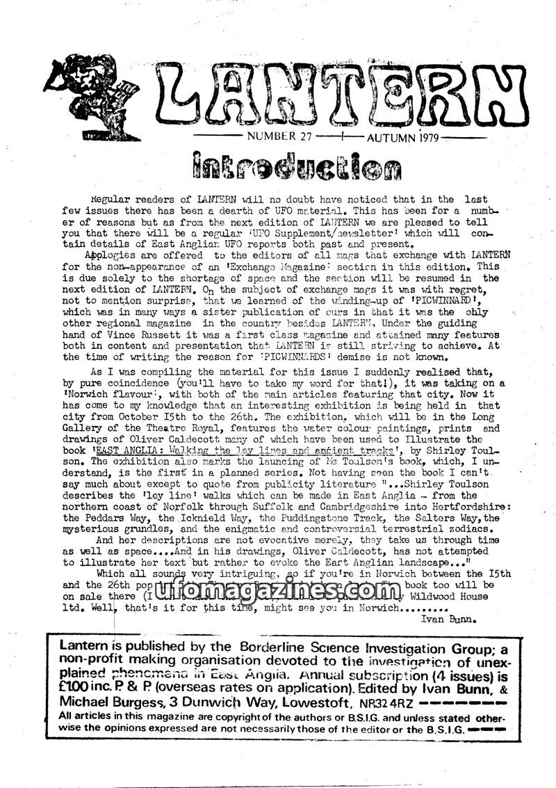 This issue of LANTERN magazine, dated Autumn 1980, focuses on unexplained phenomena in East Anglia. The editor, Ivan Bunn, outlines the aims of the magazine and its parent group, B