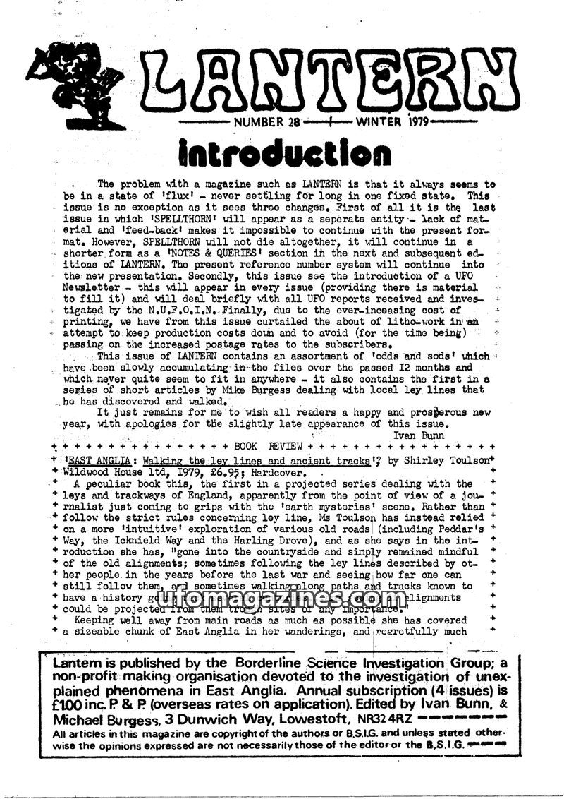 This issue of LANTERN magazine, dated Spring 1979, features a variety of articles on folklore, unexplained phenomena, and local history in East Anglia. It includes a detailed treat
