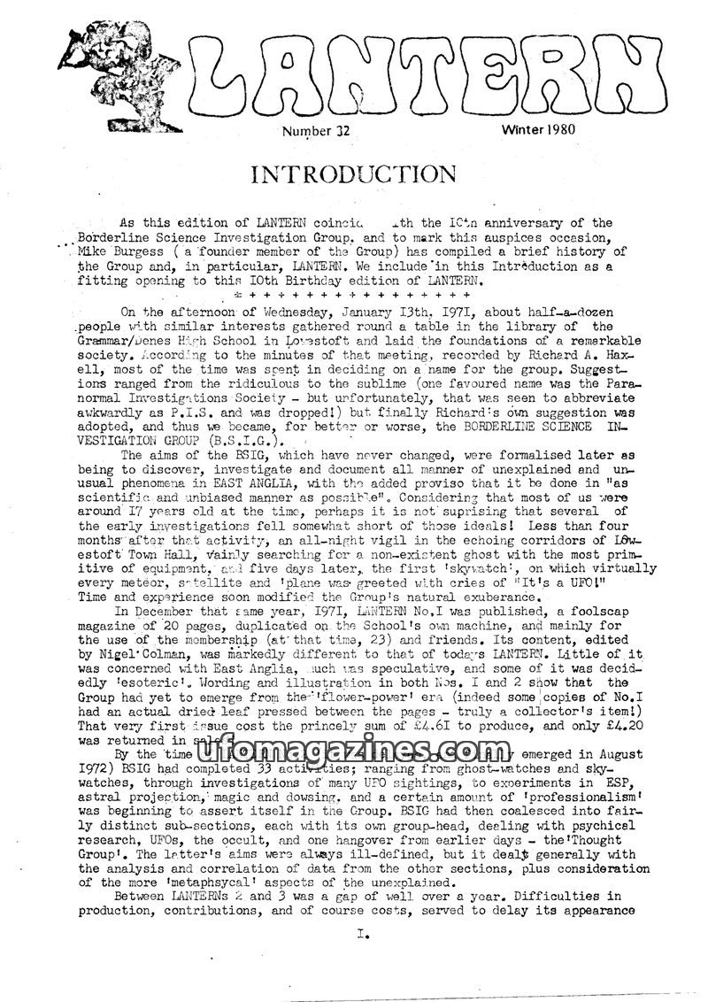 This issue of LANTERN, published in Winter 1980, marks the 10th anniversary of the Borderline Science Investigation Group (BSIG). The issue features a history of the BSIG, founded