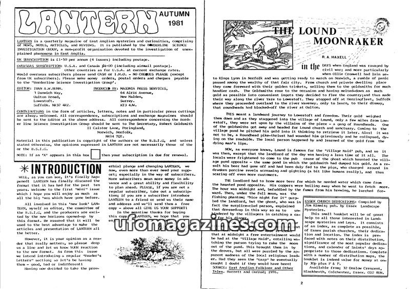 This issue of LANTERN focuses on paranormal phenomena in East Anglia, particularly ghost sightings and folklore. The main feature details the legend of 'The Lound Moonraker' and in