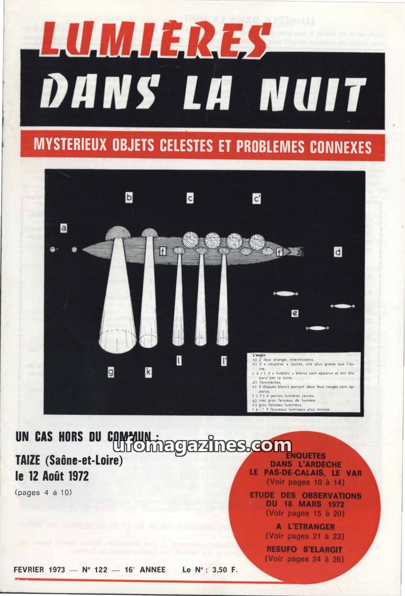This issue of Lumières dans la Nuit features a detailed investigation into a significant UFO sighting in Taizé, France, on August 12, 1972, involving multiple witnesses and a large