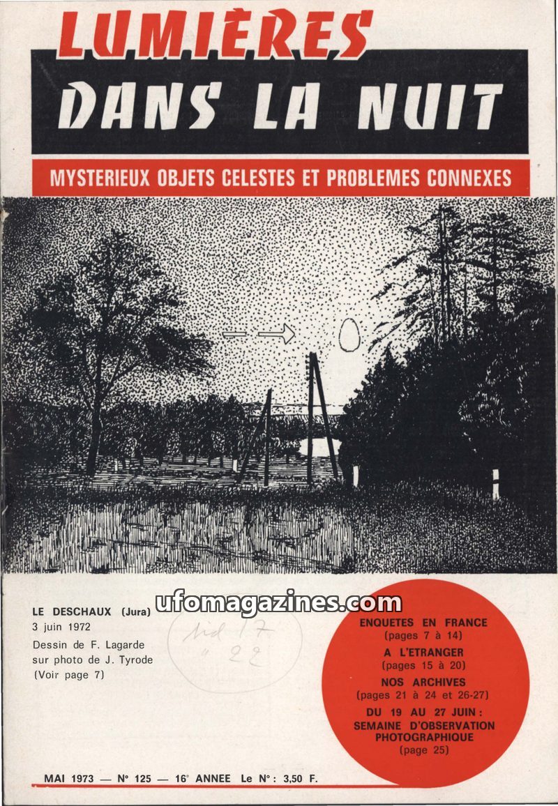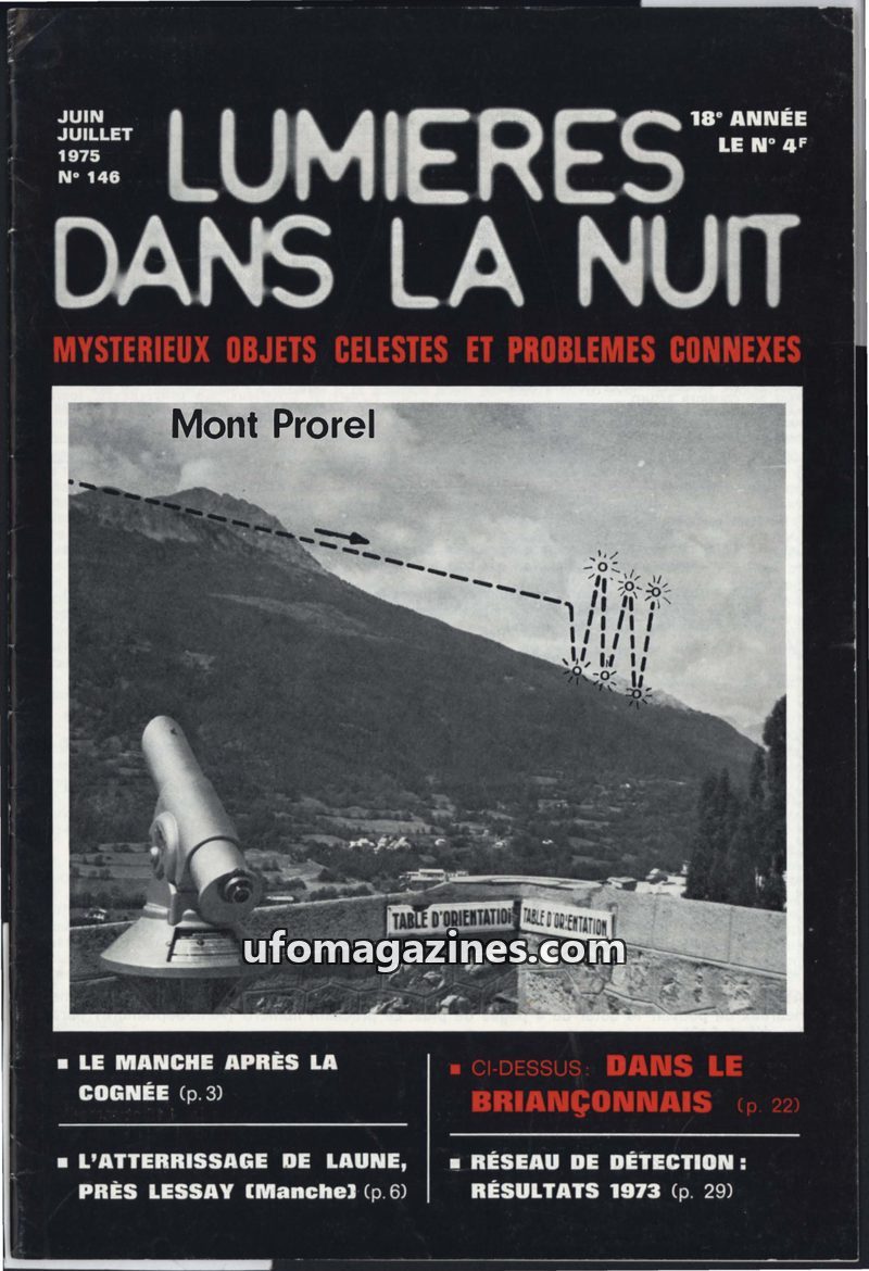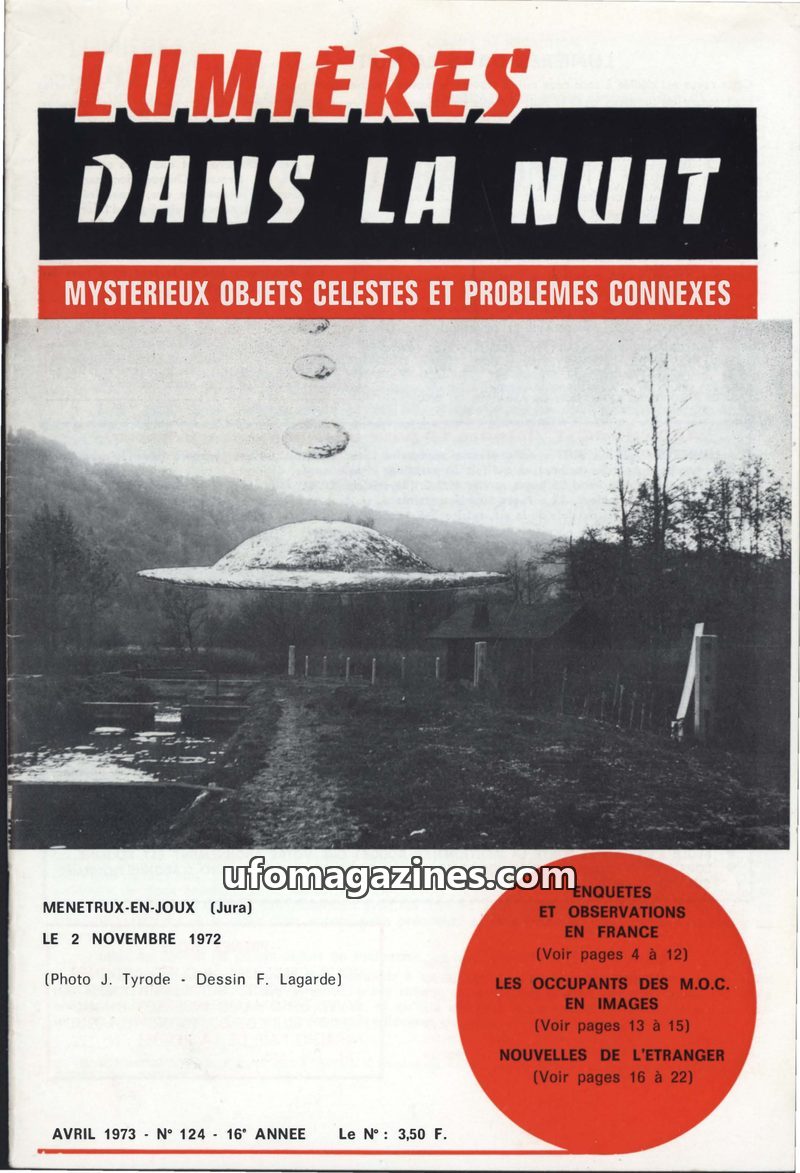 This issue of Lumières Dans La Nuit focuses on UFO sightings and investigations in France. It details a significant sighting in Ménétrux-en-Joux, Jura, by M. Vuillien, who observed
