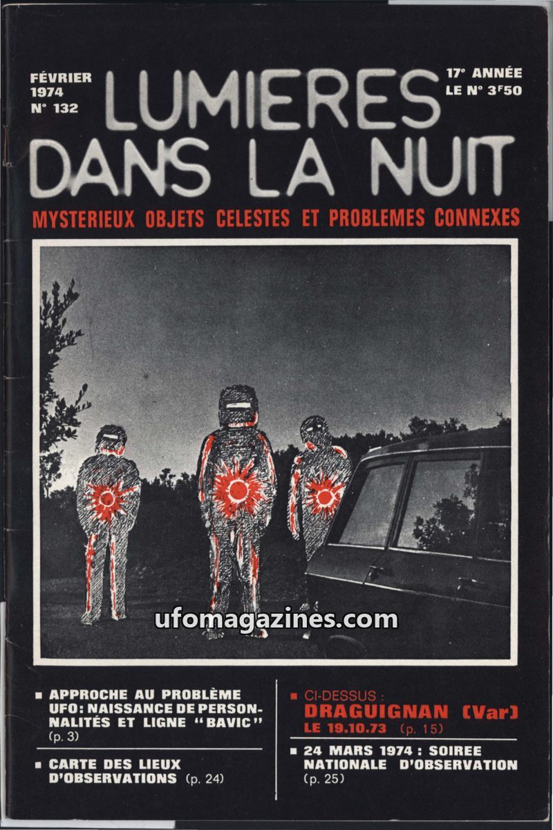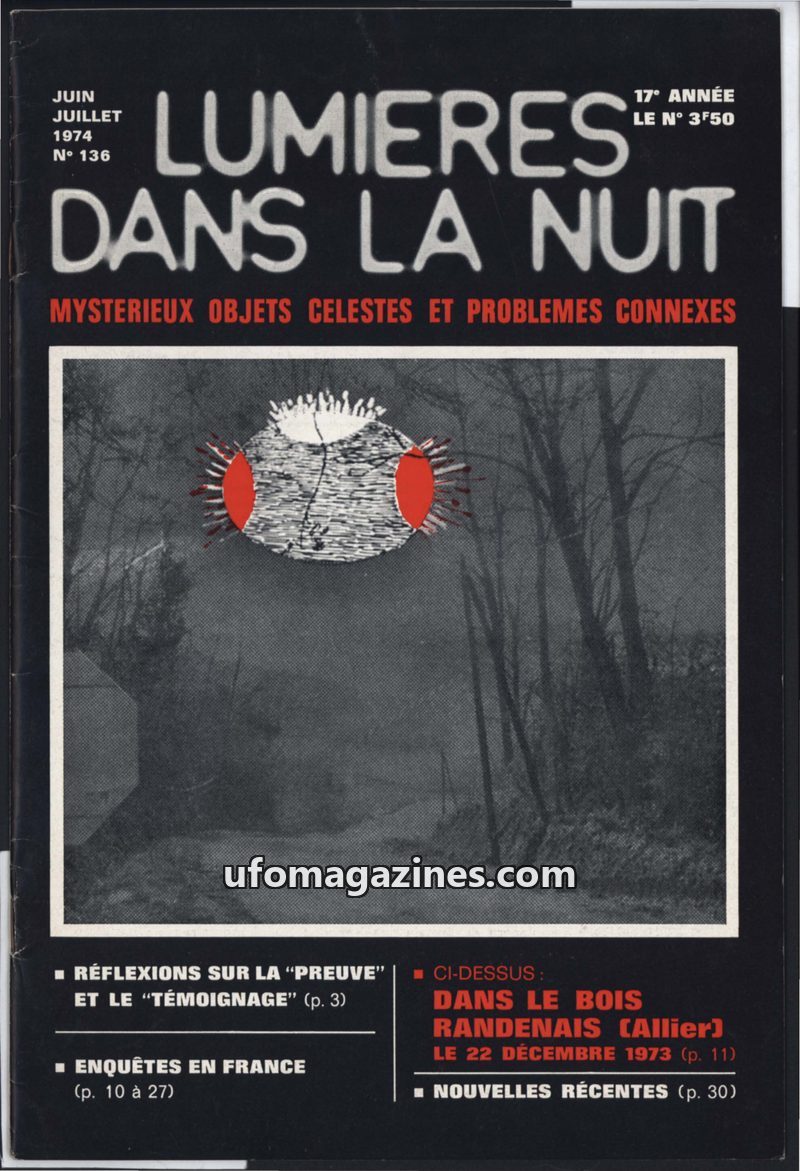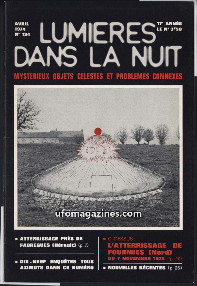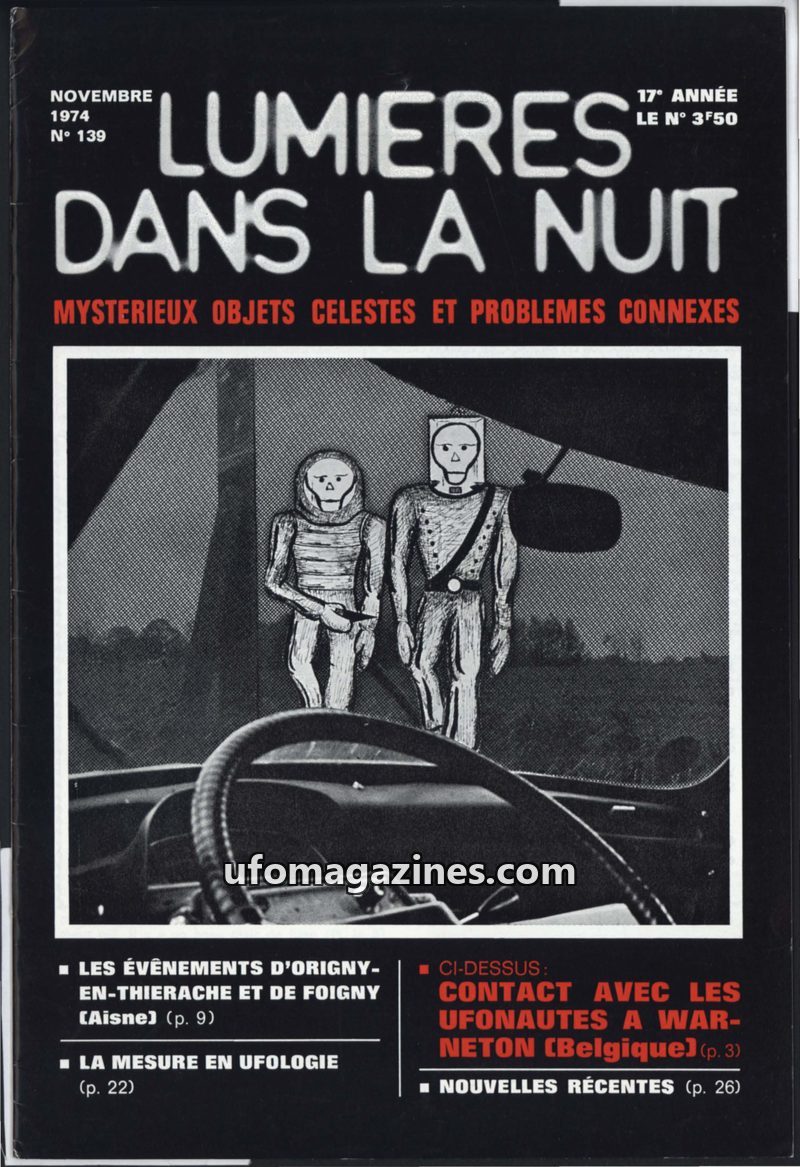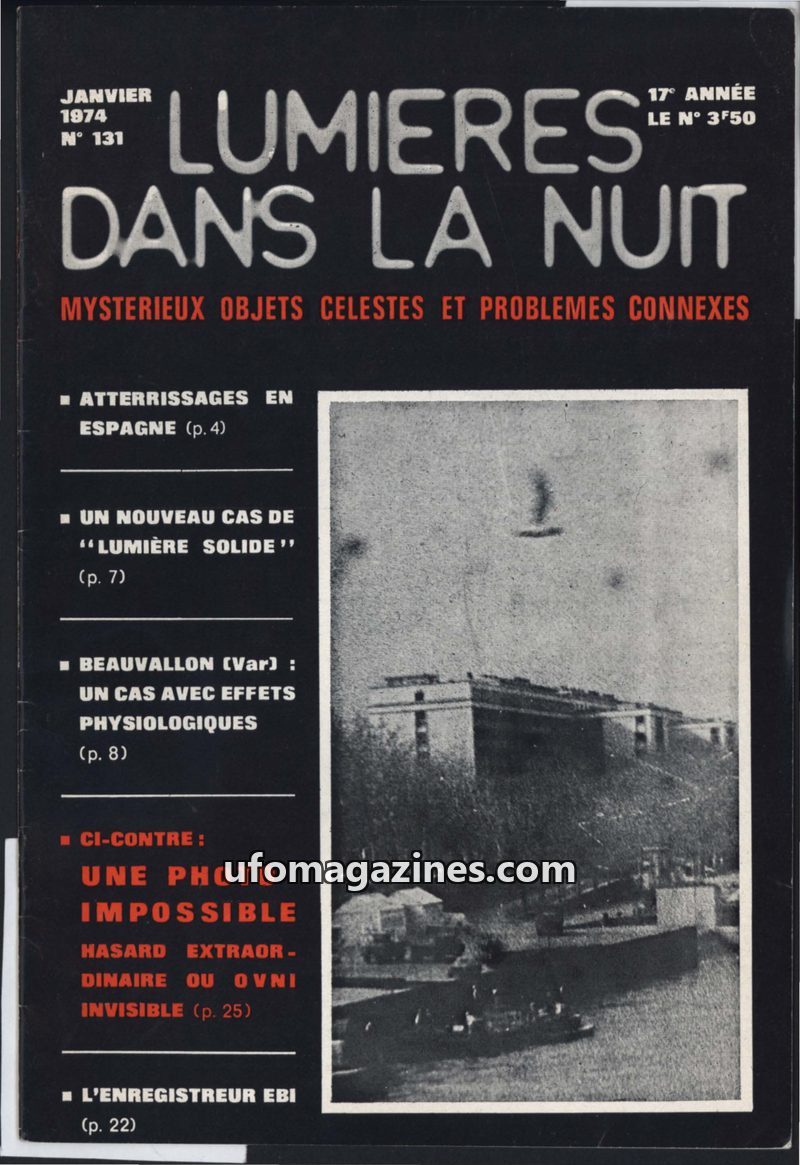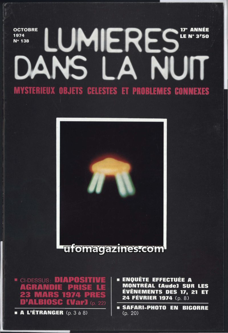 This issue of Lumières dans la Nuit from October 1974 delves into various UFO sightings and related phenomena. It includes a detailed account of a fatal incident in Brazil in 1946