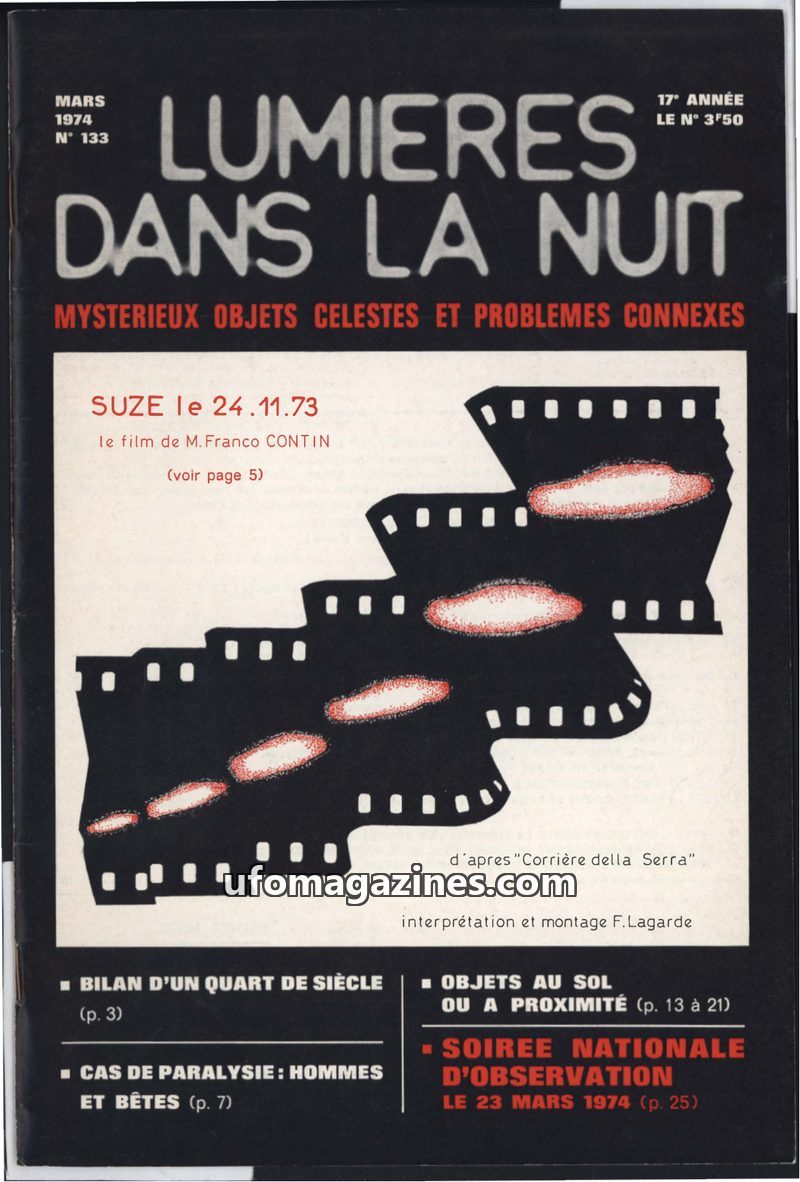 This issue of Lumières dans la Nuit features a report on the Suze UFO film from 1973, detailing observations in Italy and Spain. It includes a military report from Finland and an i