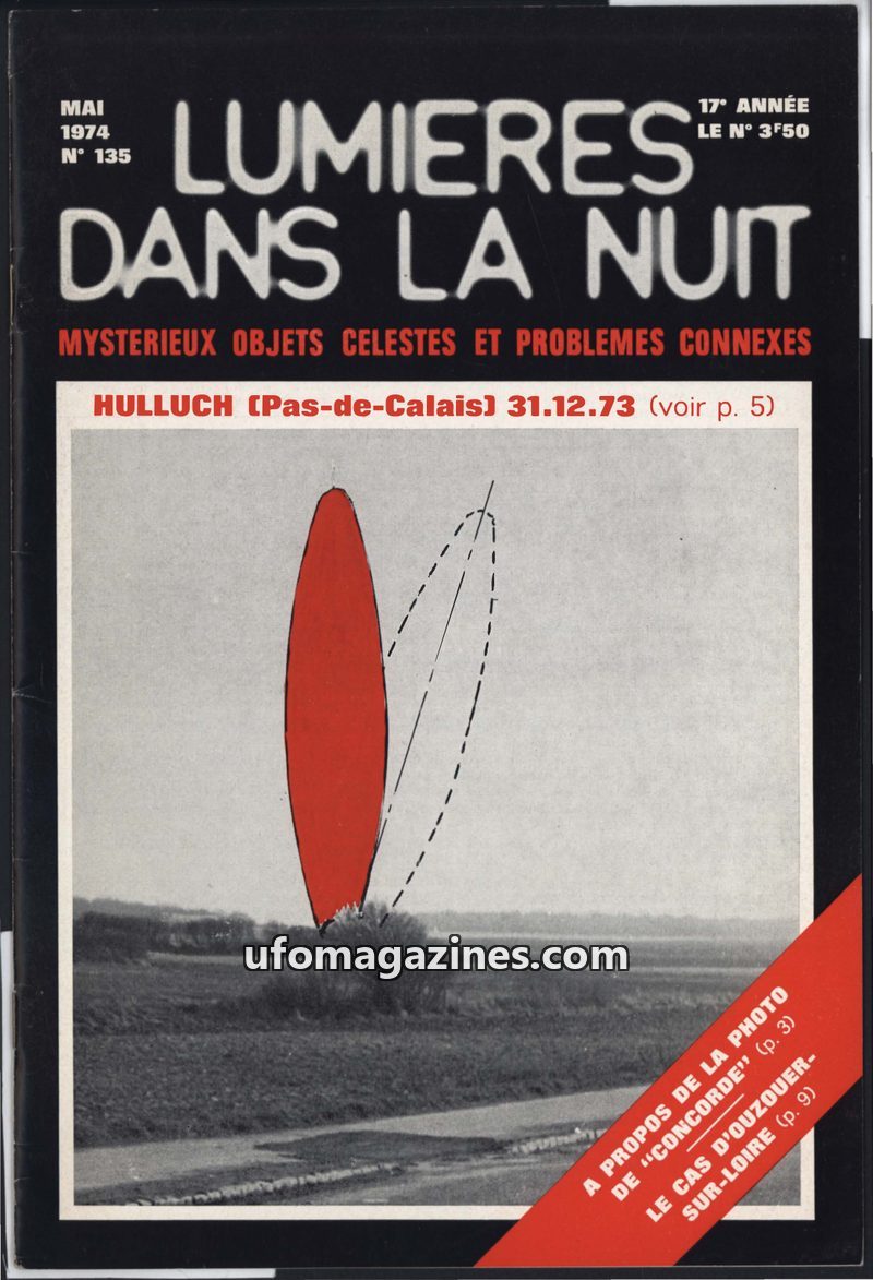 This issue of Lumières dans la Nuit focuses on UFO sightings and investigations, particularly the Hulluch case in Pas-de-Calais from December 31, 1973. It includes detailed witness