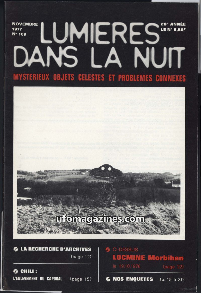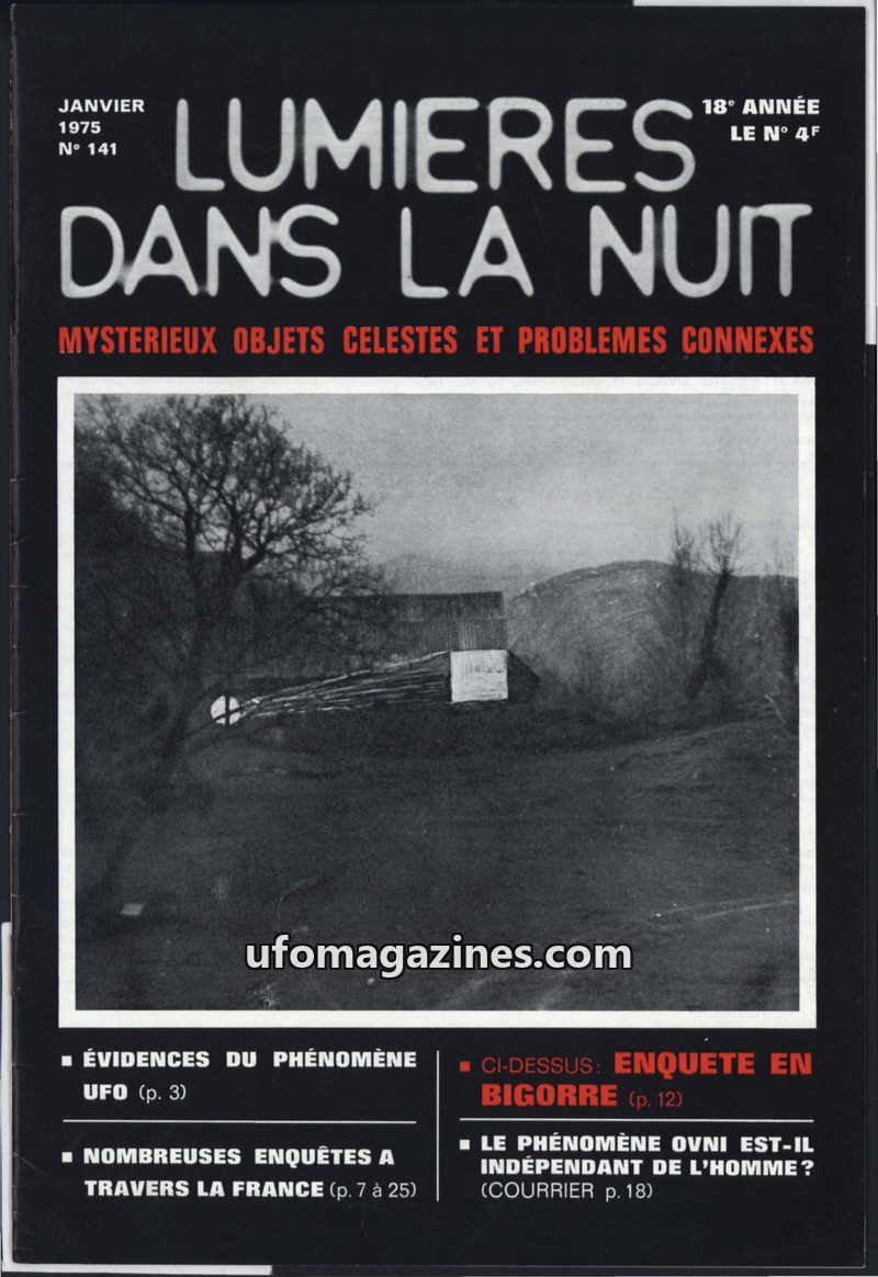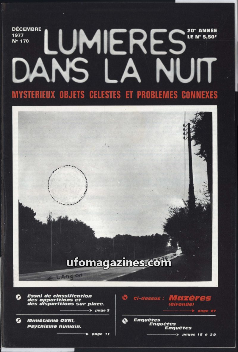 This issue of Lumières dans la Nuit focuses on UFO investigations in France during the 1970s. It features detailed accounts of sightings, including a 'quasi-landing' near Missancou