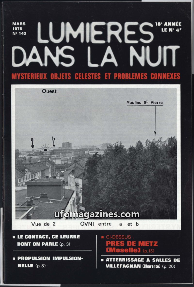 This issue of LUMIÈRES DANS LA NUIT from March 1975 delves into the complex world of UFO phenomena. It features an article by F. Lagarde questioning the nature of 'contact' with al