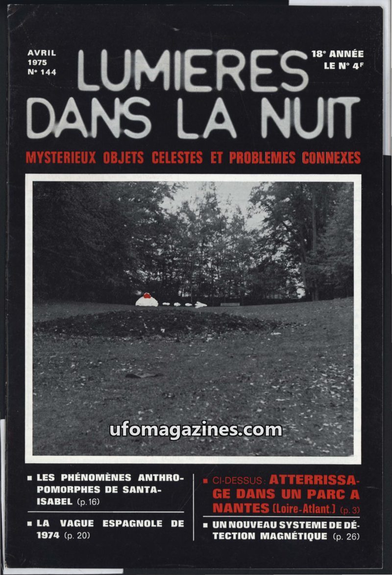 This issue of 'Lumières dans la Nuit' (April 1975) delves into various UFO and anomalous phenomena reports. It features an investigation into a suspected UAP landing in Nantes, Fra