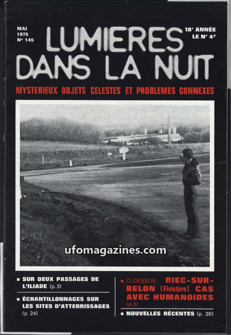This issue of Lumières dans la Nuit from May 1975 delves into various UFO phenomena. It includes an analysis of ancient texts, specifically Homer's Iliad, for potential technologic