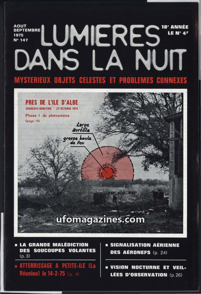 This issue of Lumières dans la Nuit focuses on UFO sightings and investigations from August-September 1975. It includes detailed reports on a phenomenon near Ile d'Albe, a landing