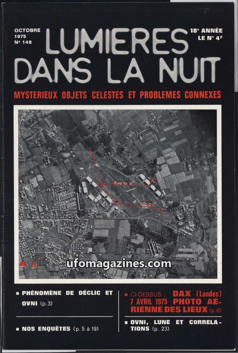 This issue of Lumières dans la Nuit from October 1975 delves into various UFO sightings and related phenomena. It features reports from France, including incidents in Dax and Aire-
