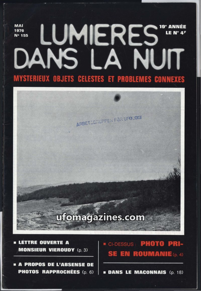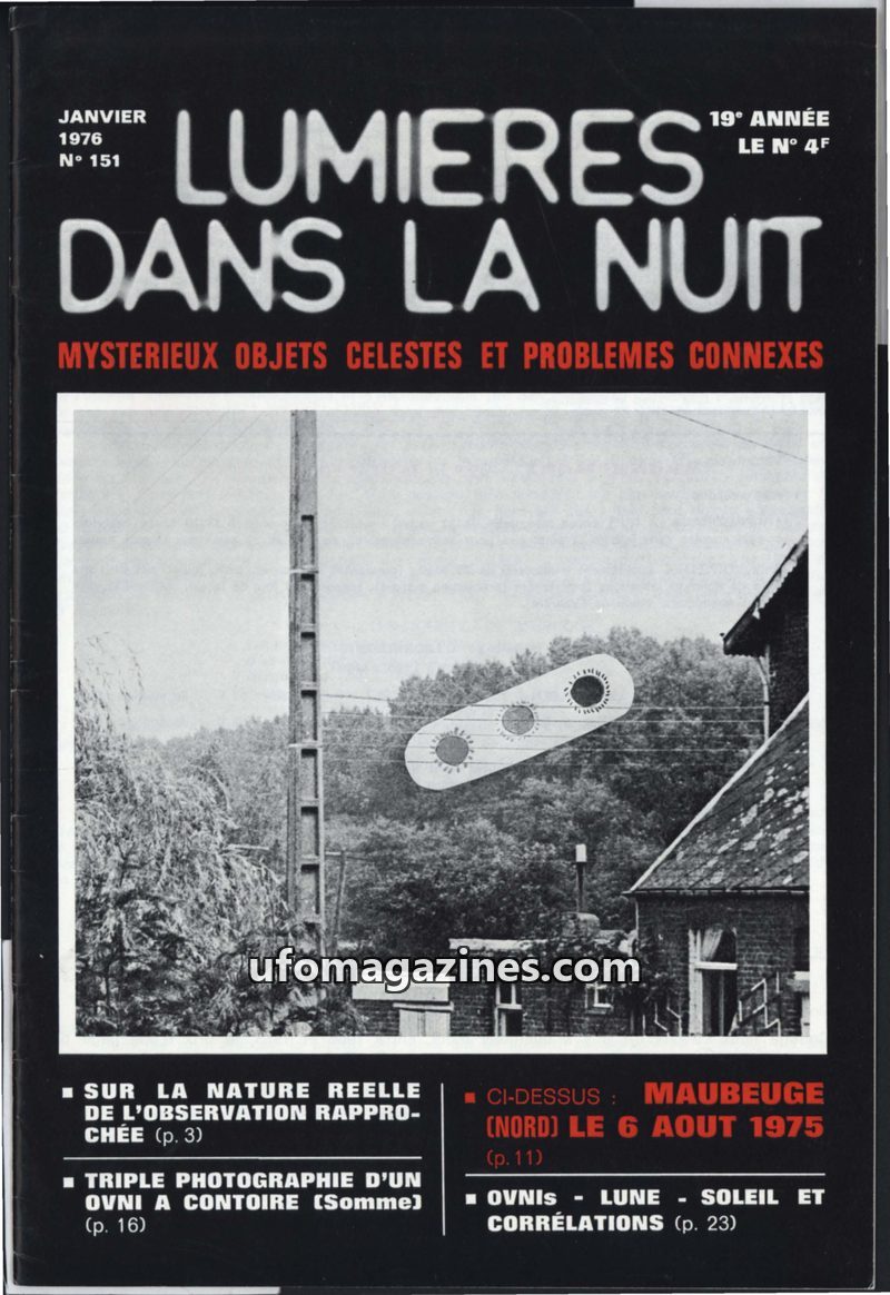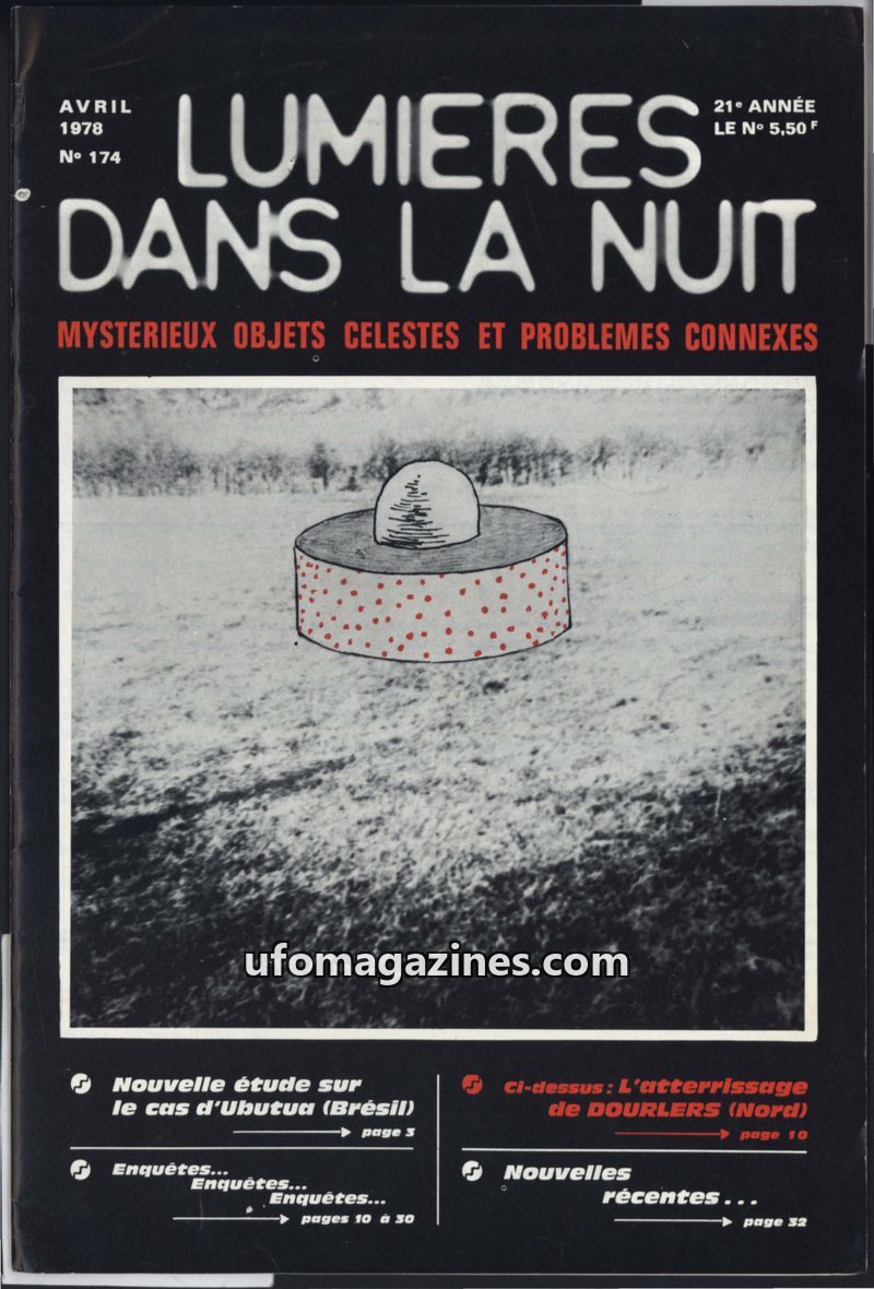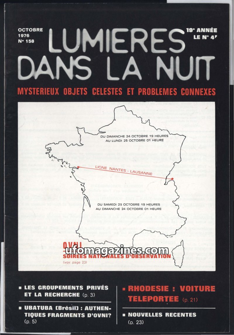 This issue of Lumières dans la Nuit from October 1976 delves into various UFO phenomena. It features an in-depth analysis of alleged UFO fragments found in Ubatuba, Brazil, discuss