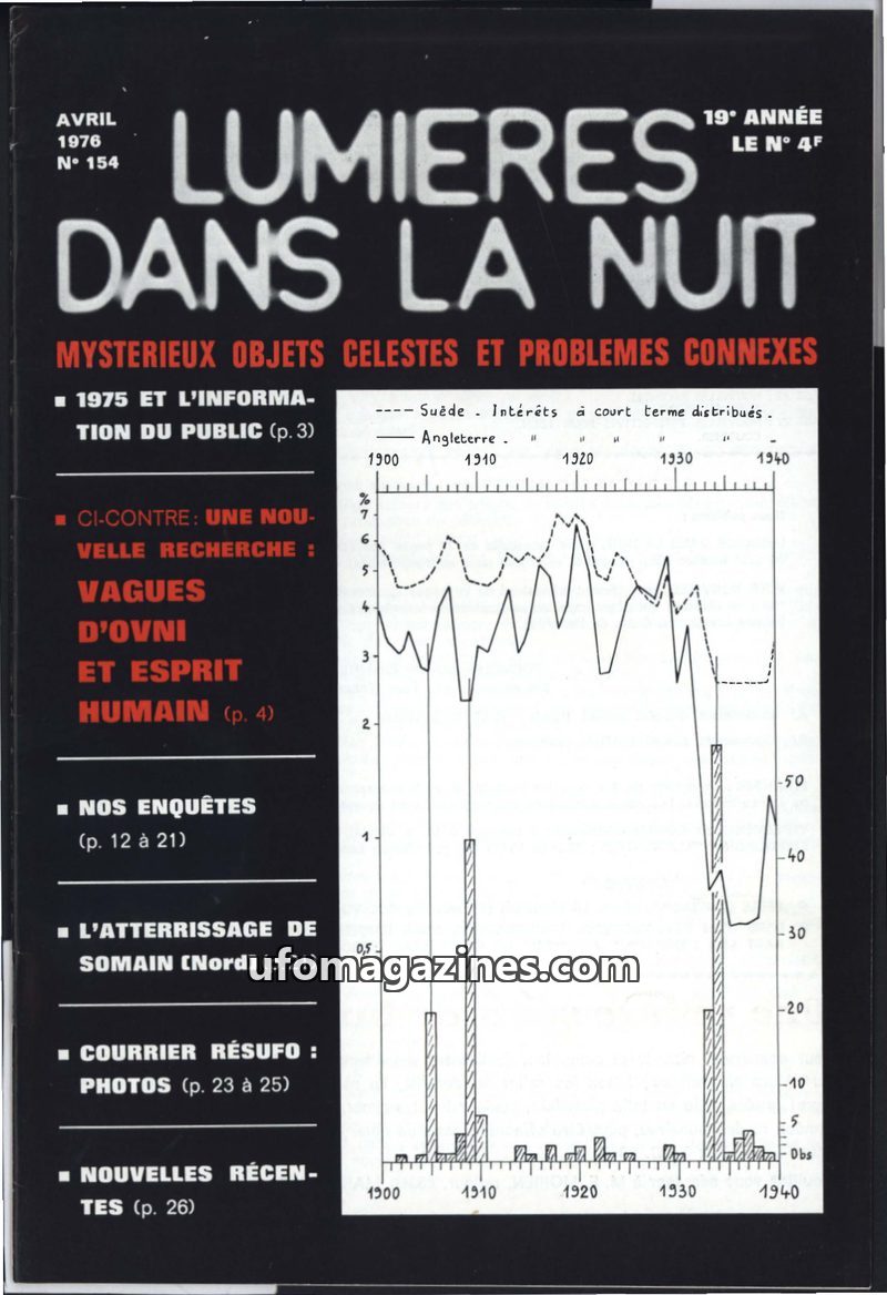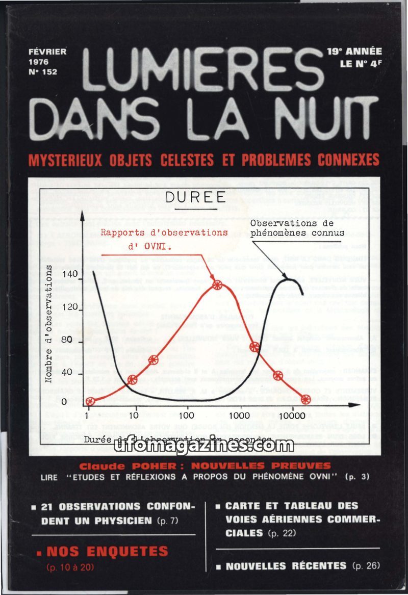 This issue of 'Lumières dans la Nuit' from February 1976 delves into the UFO phenomenon with a focus on scientific analysis and witness testimonies. Claude Poher presents new evide
