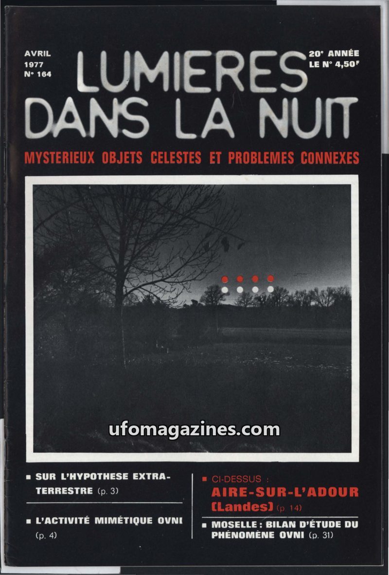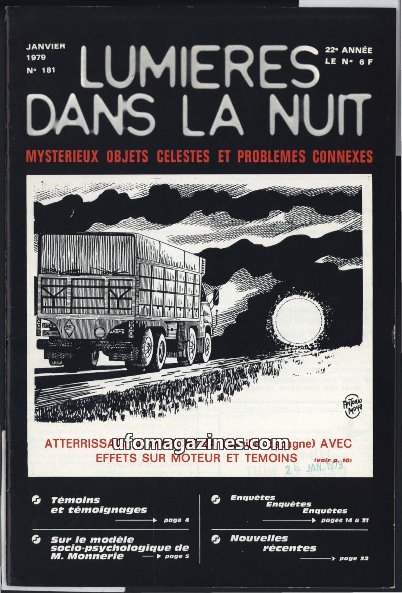 This issue of Lumières dans la Nuit focuses on UFO investigations and theoretical explorations of MHD aerodynes. It presents detailed witness accounts of sightings in various locat