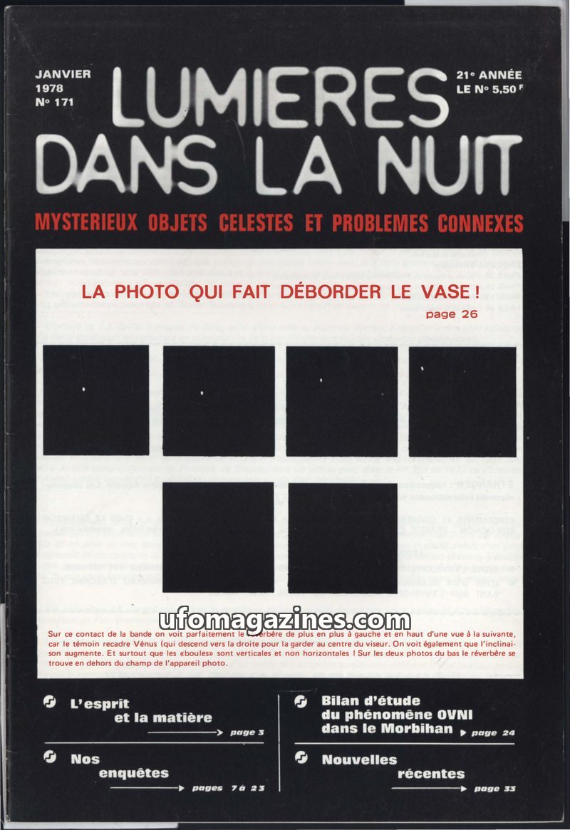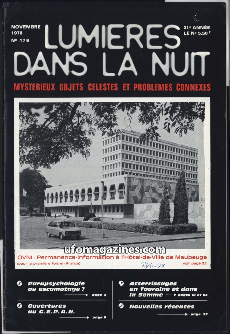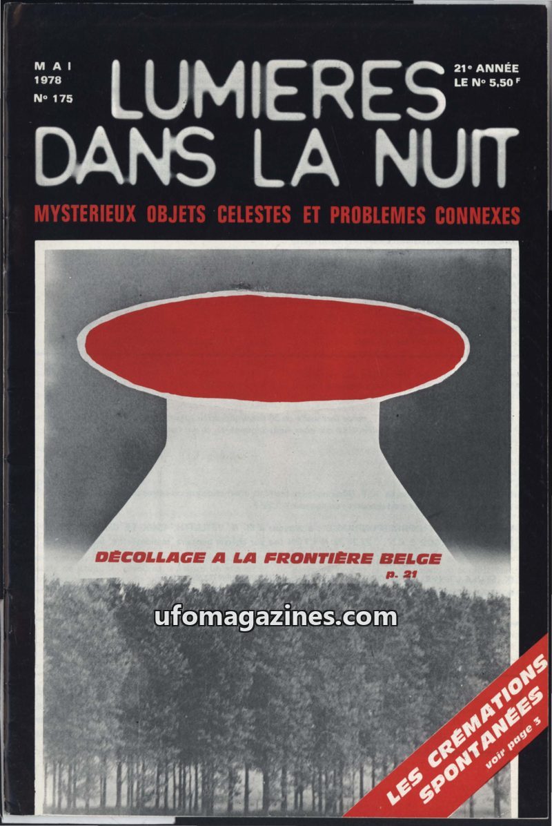 This issue of Lumières dans la Nuit delves into various UFO phenomena and related topics. It includes reports on UFO sightings in Belgium, Corsica, France, and the Var region, as w