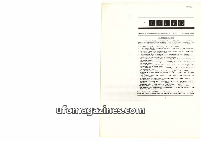 This issue of 'Lettre d'Information Ufologique' from December 1989 focuses on recent press coverage of UFO phenomena, particularly from the USSR and Canada. It includes reports fro