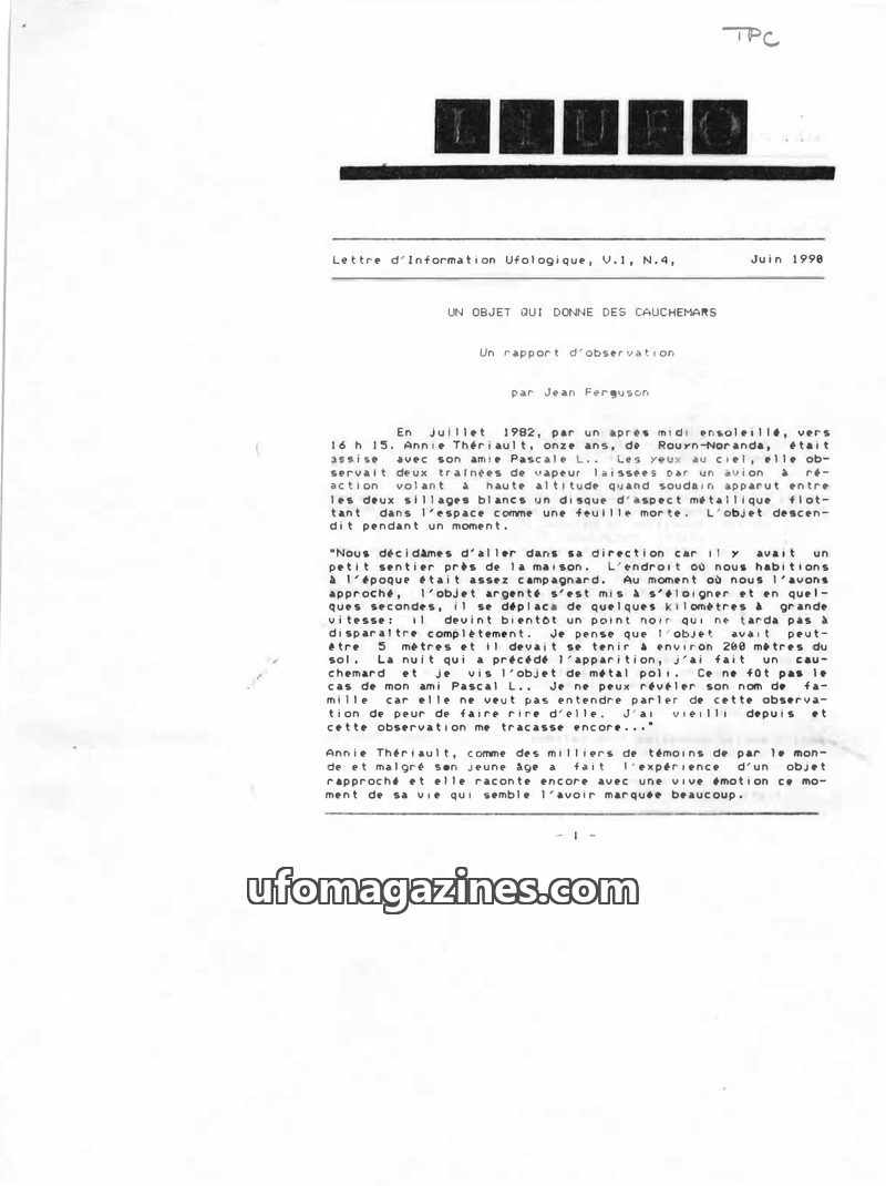 This issue of Lettre d'Information Ufologique features a report on a childhood UFO sighting in Rouyn-Noranda, Canada, by Annie Theriault. It also includes a detailed survey of reti