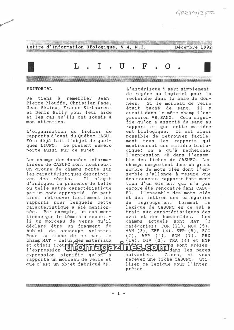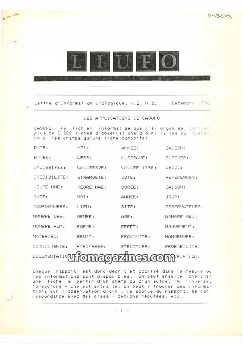 This issue of LIUFO details the CASUFO database, which contains over 2,200 UFO observation reports from Quebec. It explains the various fields used to codify each report, including