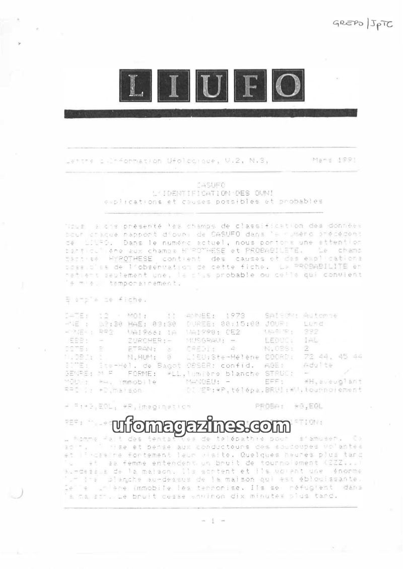 This issue of LIUFO focuses on the identification of UFOs (OVNI) and their probable causes, building on previous CASUFO reports. It introduces a classification system with 'Hypothe