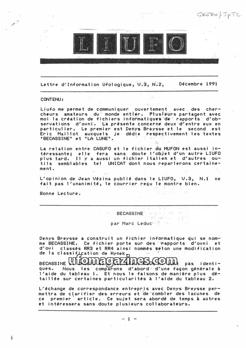 This inaugural issue of LIUFO, a French-language ufological newsletter from Canada, aims to foster information exchange among enthusiasts. It critiques Richard Glenn's misinterpret