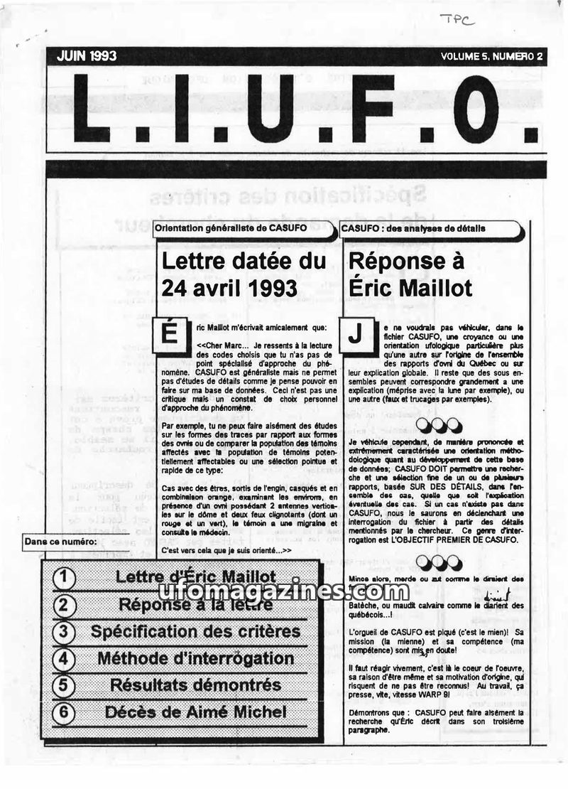 This issue of LIUFO focuses on the CASUFO database and its application in detailed UFO case analysis, particularly in response to criteria set by Éric Maillot. It highlights how CA