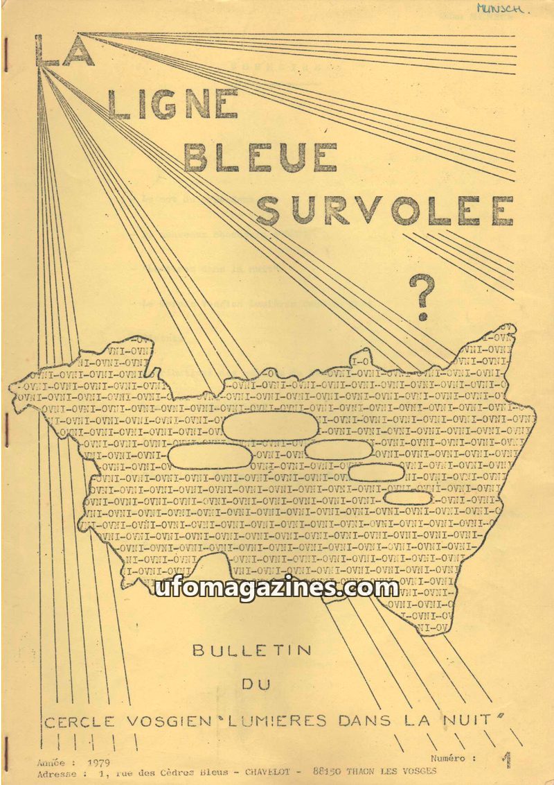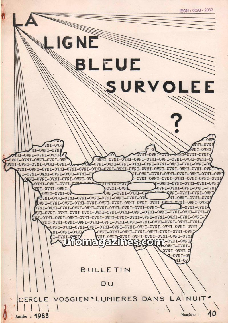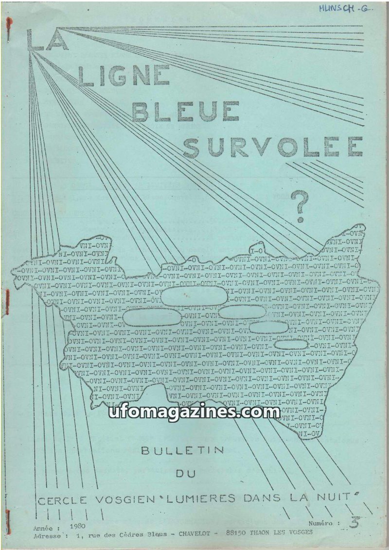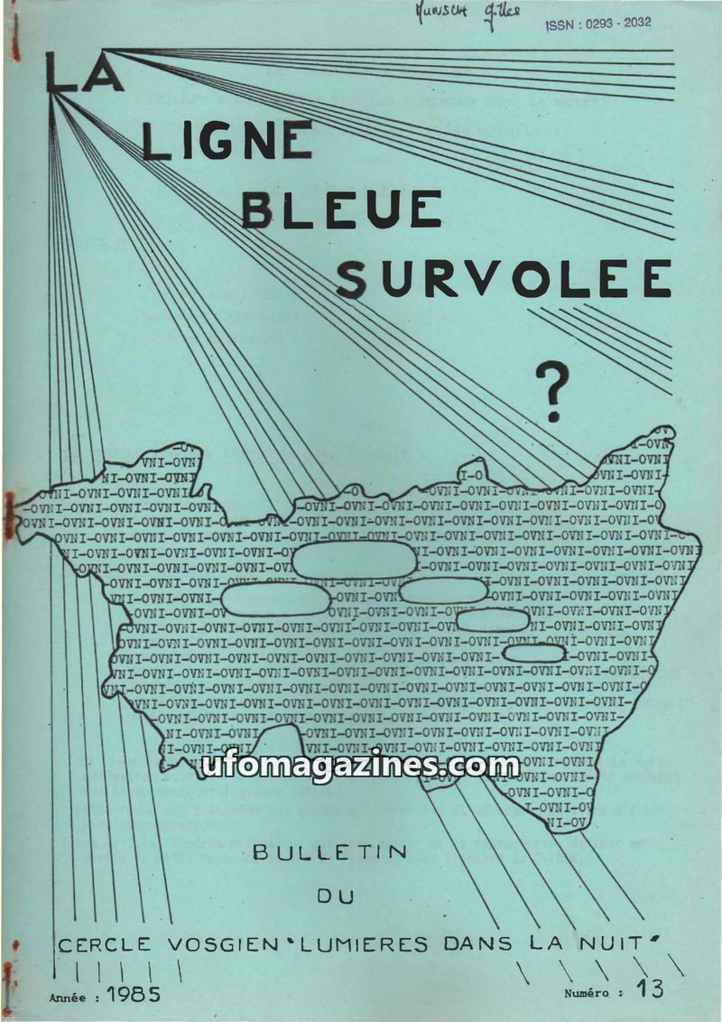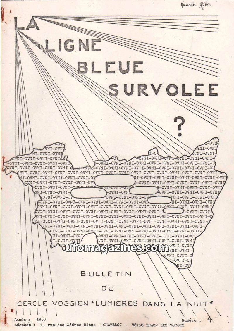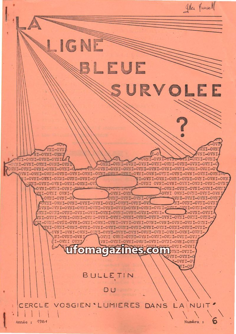 This issue of "La Ligne Bleue Survolée" from the "Cercle Vosgien Lumieres dans la Nuit" (1981, issue 6) compiles press archives and investigation reports on UFO phenomena. It highl