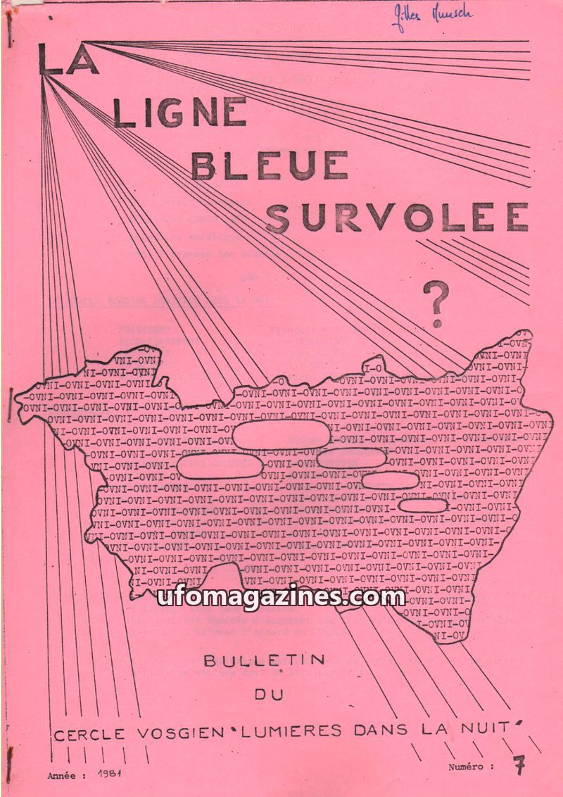 This issue of 'La Ligne Bleue Survolee ?' from the Cercle Vosgien Lumières Dans La Nuit (1981, issue 7) focuses on UFO sightings and related discussions. It includes a detailed tab
