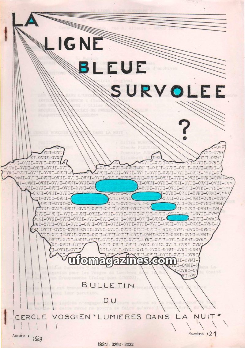 This issue of 'La Ligne Bleue Survolée?' from the Cercle Vosgien Lumières Dans La Nuit focuses on UFO investigations and reports. It includes a president's letter discussing the gr