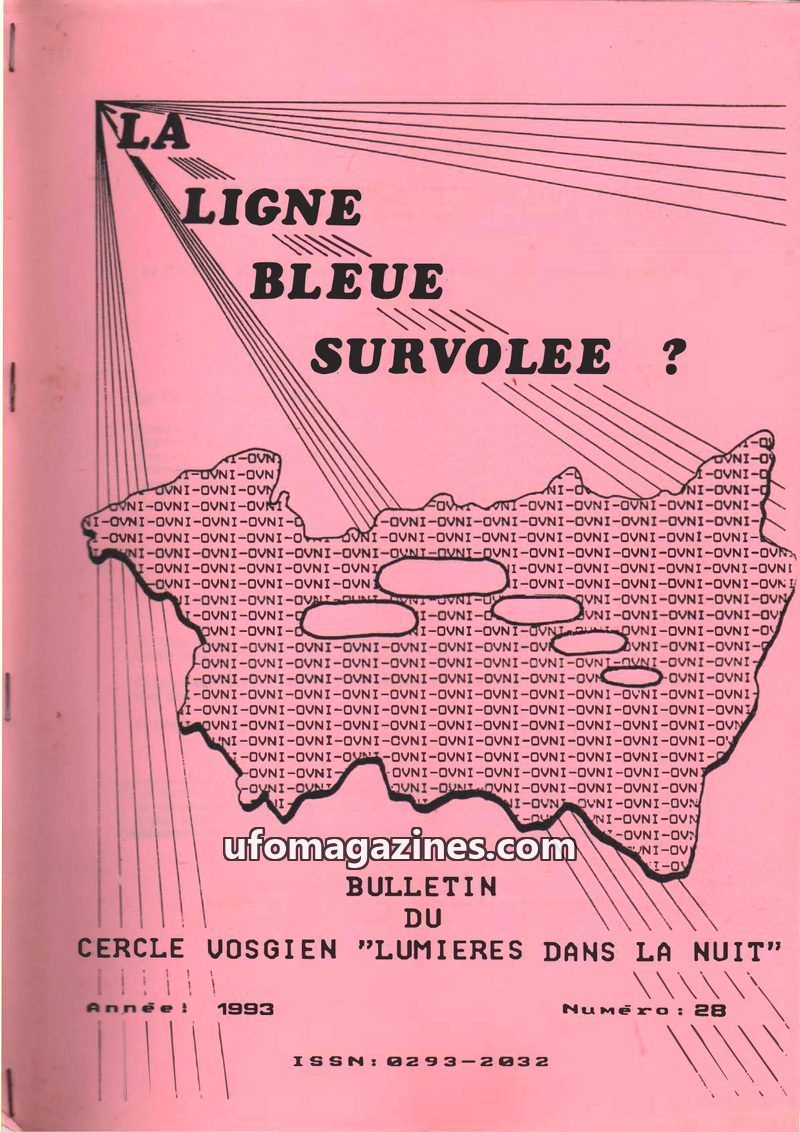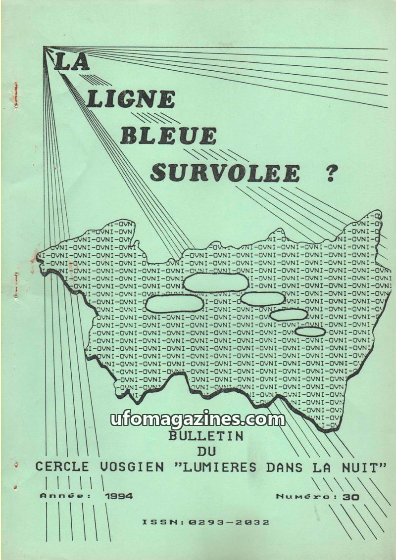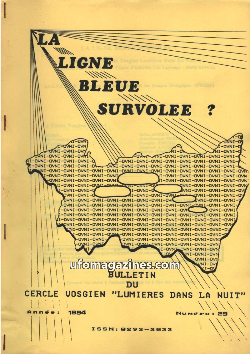 This issue of "La Ligne Bleue Survolée ?" (1994, issue 29) from the Cercle Vosgien "Lumières Dans La Nuit" focuses on ufological reports and a historical investigation. The editori