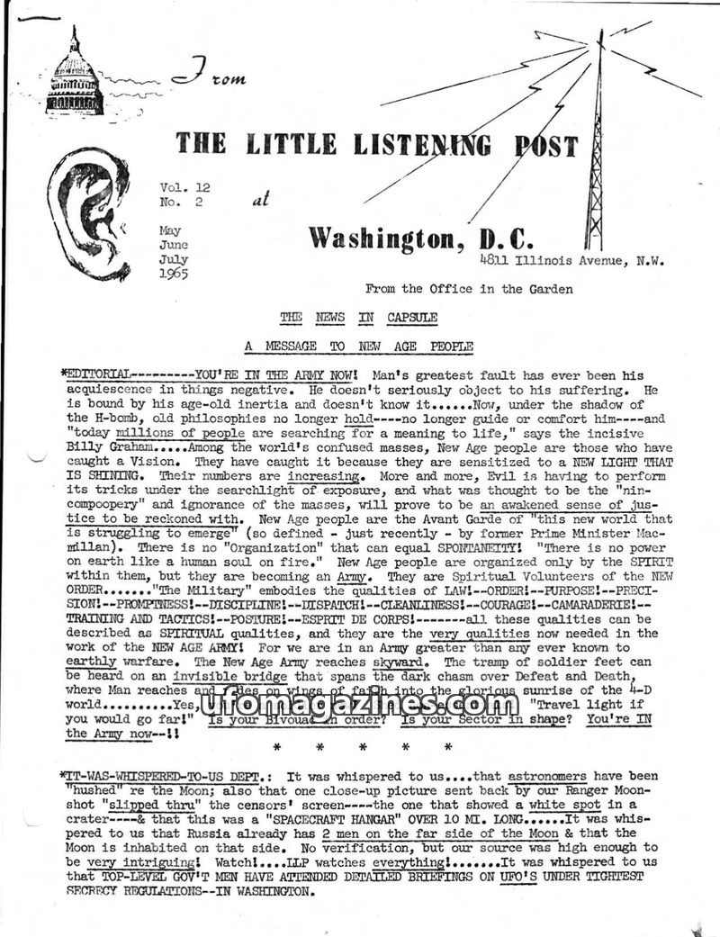 This issue of The Little Listening Post covers a range of topics including an editorial on 'New Age People' as a spiritual army, reports on alleged UFO sightings and government sec