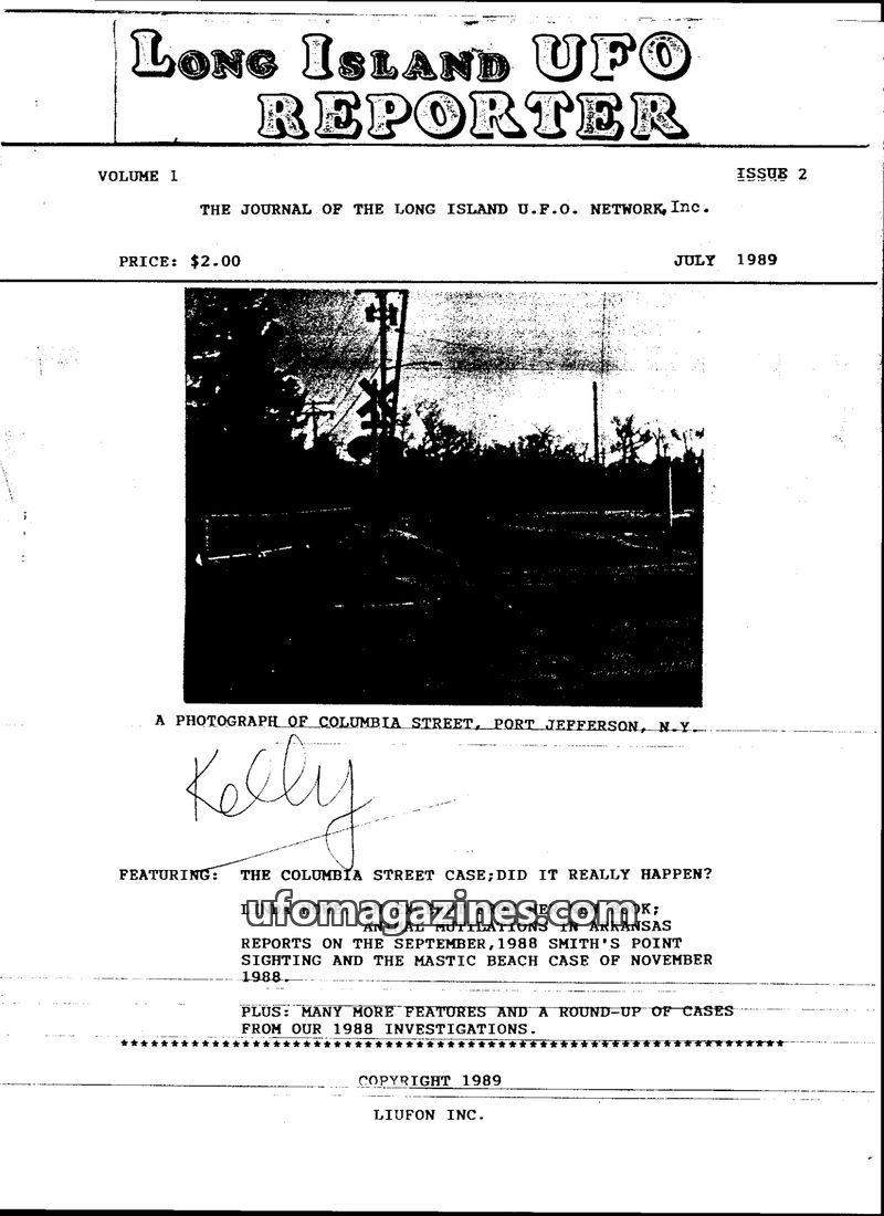 This issue of the Long Island UFO Reporter from July 1989 details numerous UFO sightings and alleged incidents on Long Island during 1988 and earlier. It prominently features an in