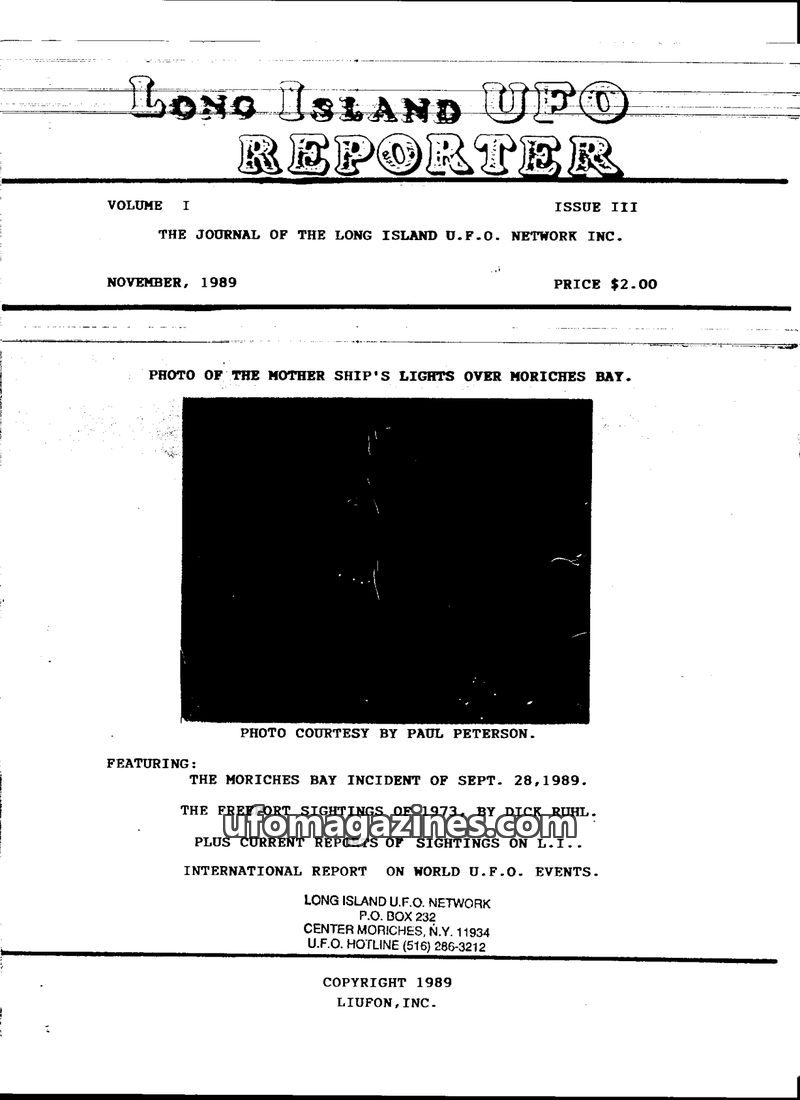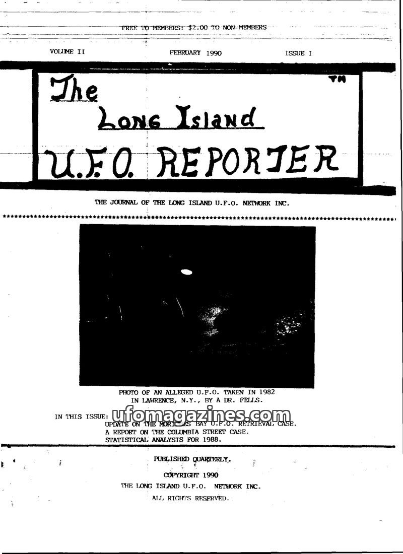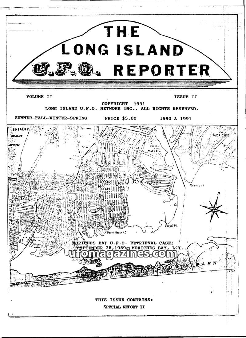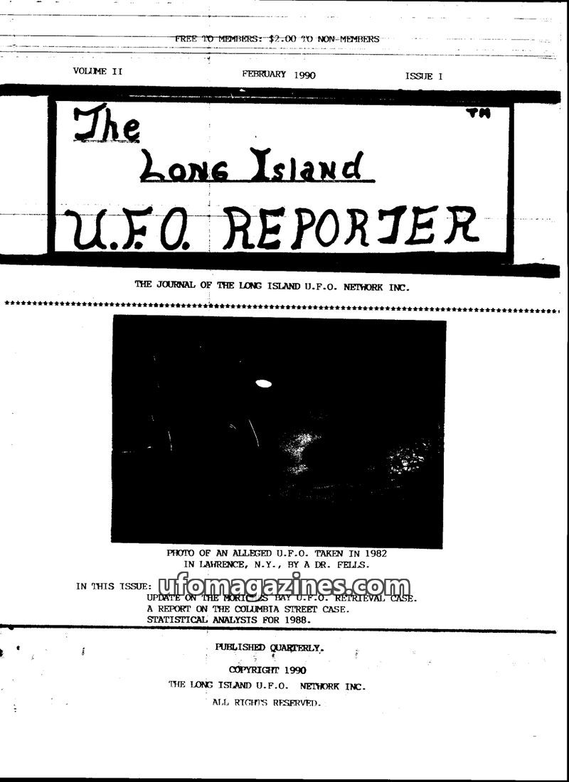 This issue of The Long Island U.F.O. Reporter details numerous UFO reports from the Long Island area, including a photo case from 1982, an update on the 1989 Moriches Bay incident