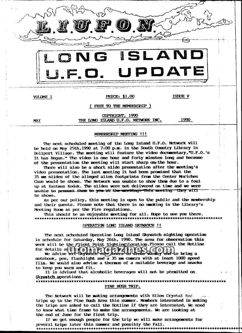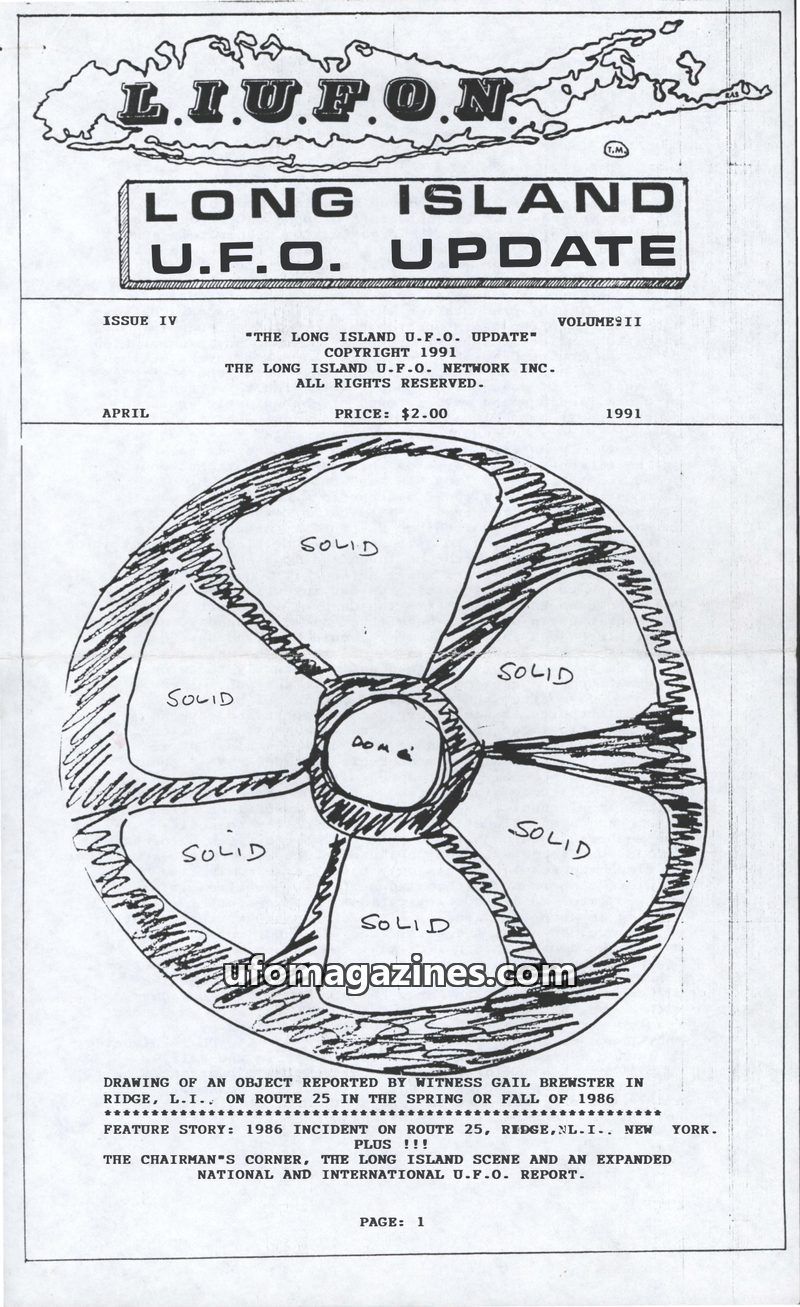 This issue of the Long Island UFO Update covers a variety of UFO-related topics. A key feature is the detailed report and drawing of a 1986 sighting by Gail Brewster in Ridge, NY.