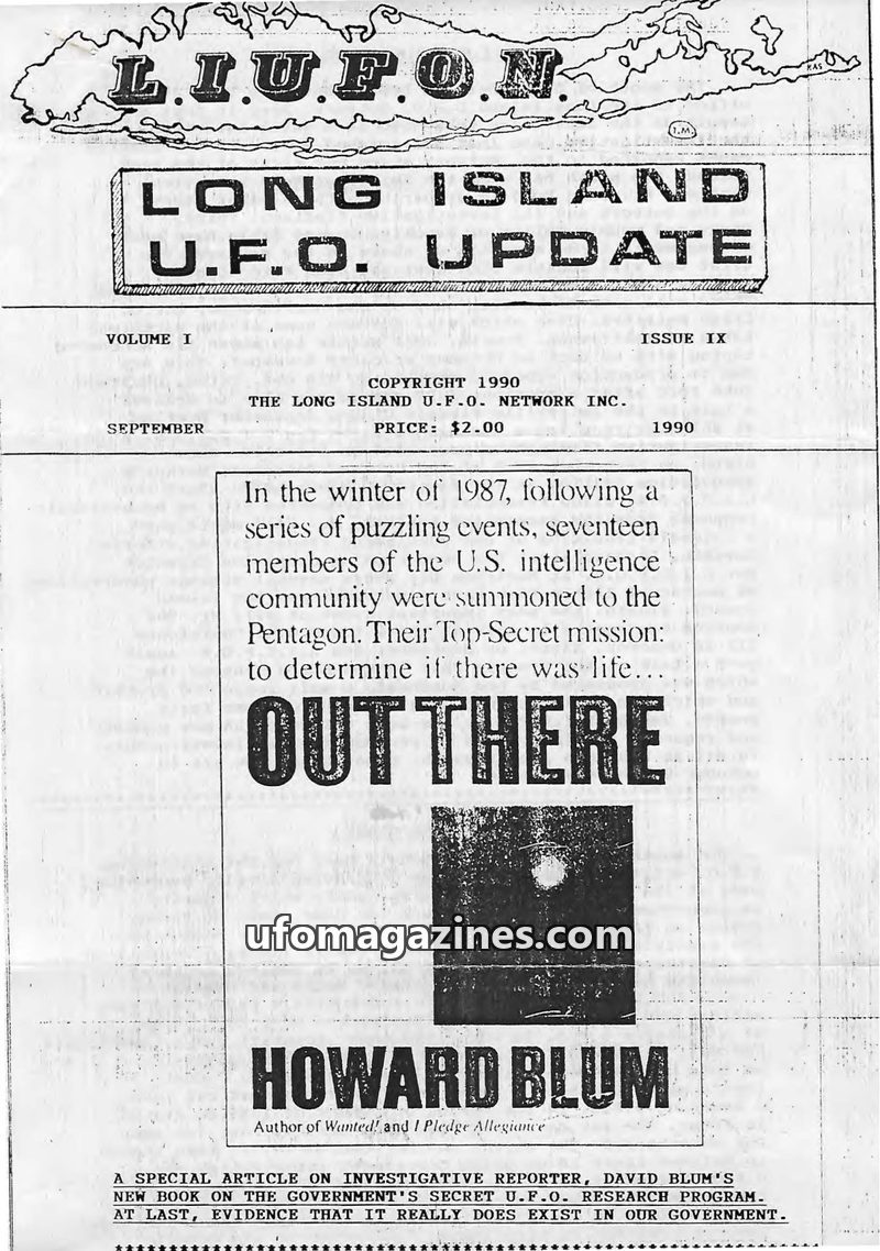This issue of Long Island UFO Update covers a range of UFO-related activities and investigations. It highlights Howard Blum's new book, 'Out There,' which details a secret governme