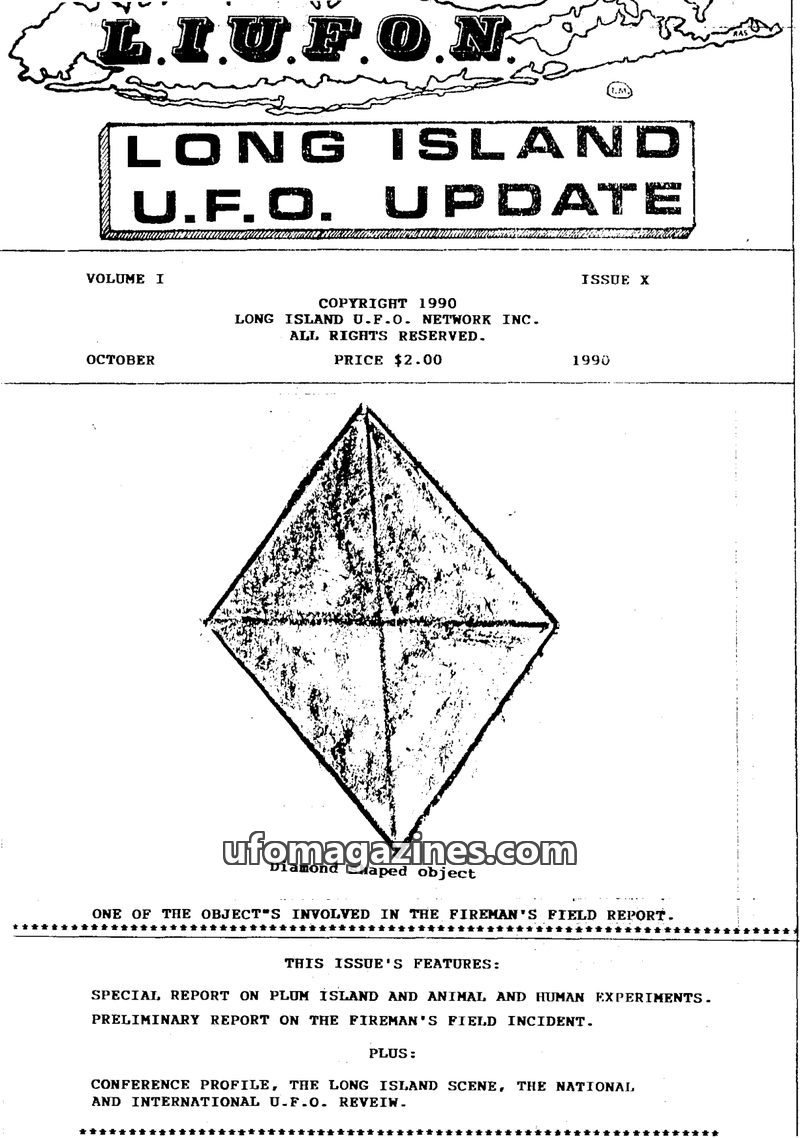 This issue of Long Island UFO Update from October 1990 covers various UFO-related events and investigations. It includes a special report on Plum Island and animal/human experiment