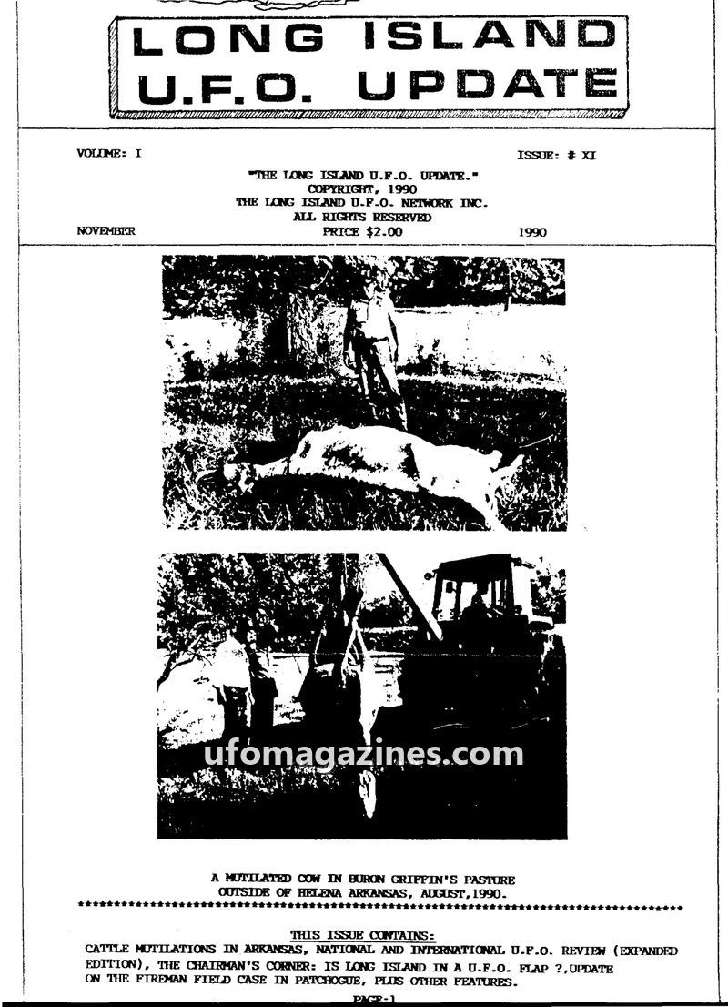 This issue of Long Island UFO Update covers a range of phenomena, including a detailed report on cattle mutilations in Arkansas and Oklahoma, featuring witness accounts and officia