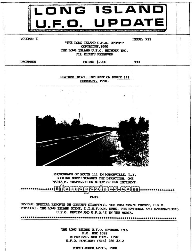This issue of the Long Island UFO Update from December 1990 covers a range of UFO phenomena. A featured story details an incident on Route 111 in February 1990 where a woman encoun