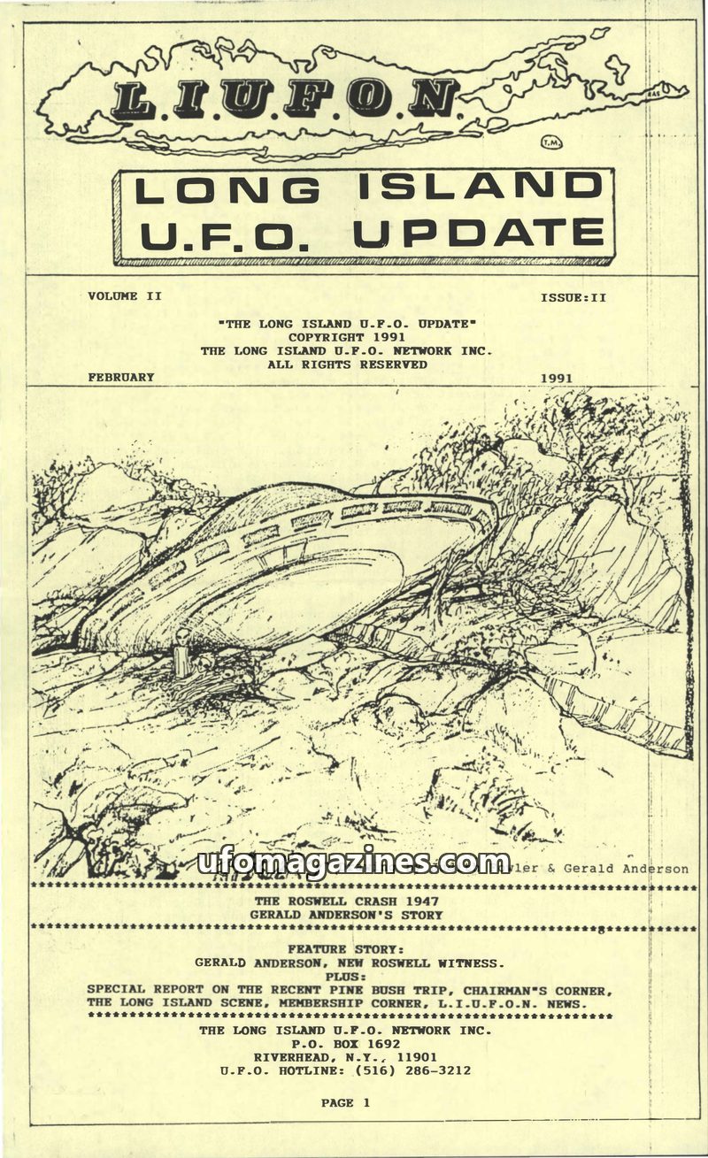 This issue of the Long Island UFO Update from February 1991 highlights a new witness to the 1947 Roswell crash, Gerald Anderson, who claims to have seen the craft and its occupants