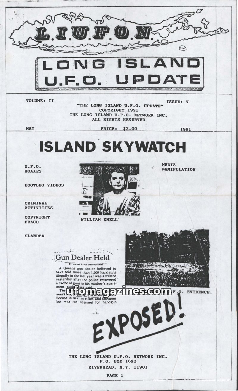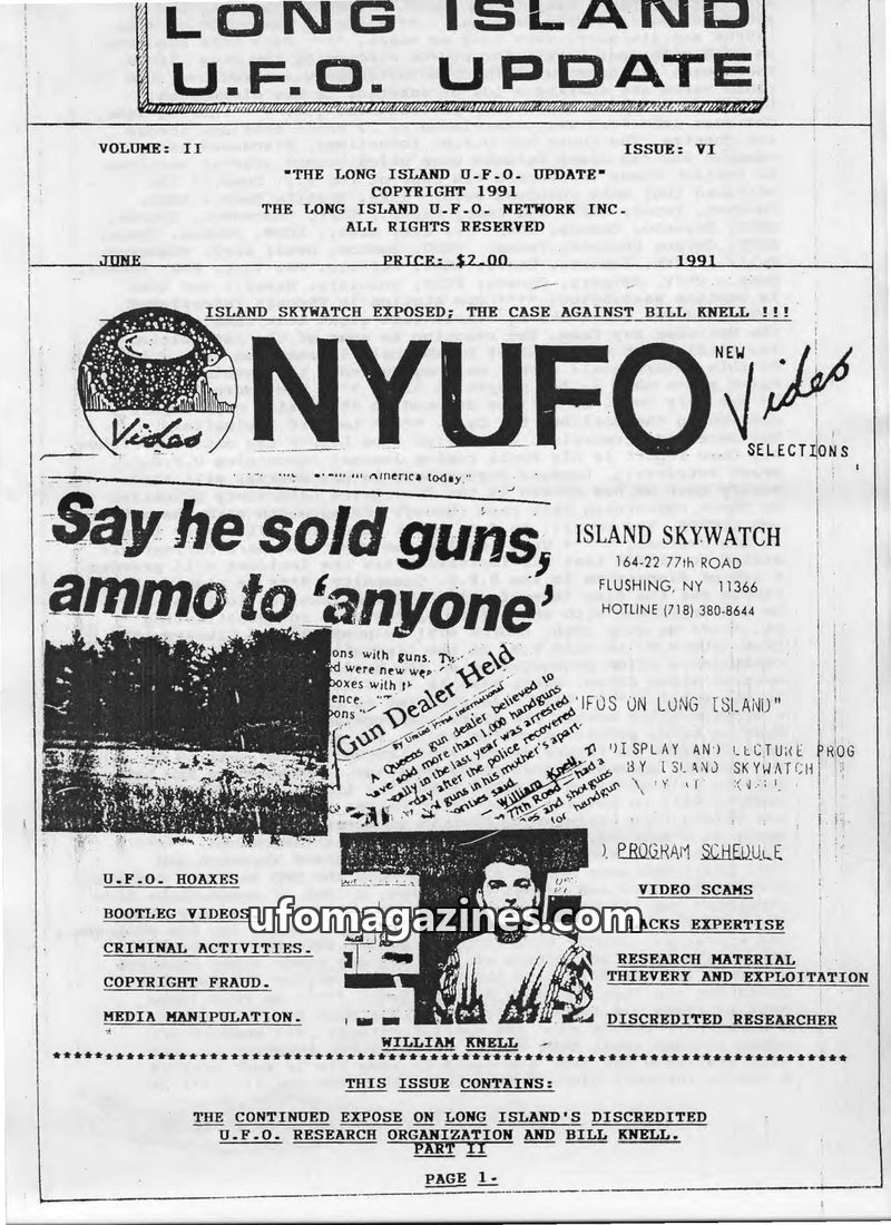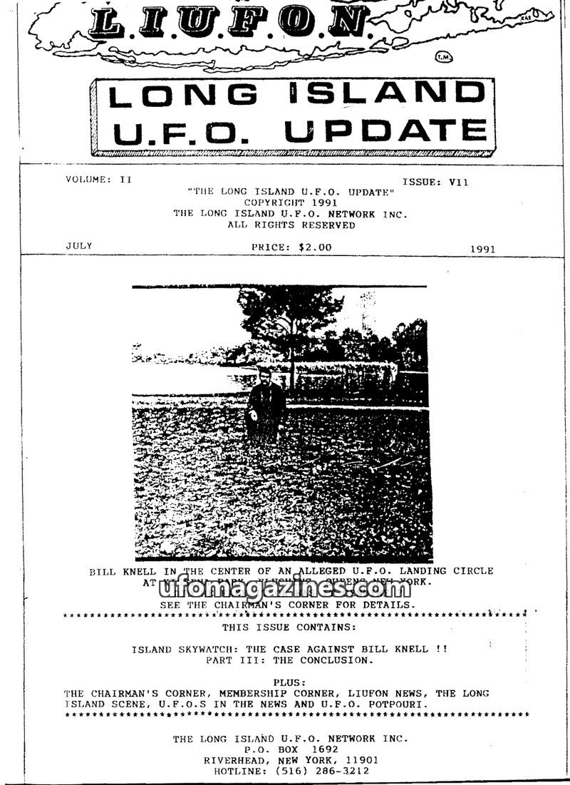 This issue of the Long Island UFO Update focuses heavily on an expose of Bill Knell and his organization, Island Skywatch, detailing allegations of fraud, copyright infringement, a
