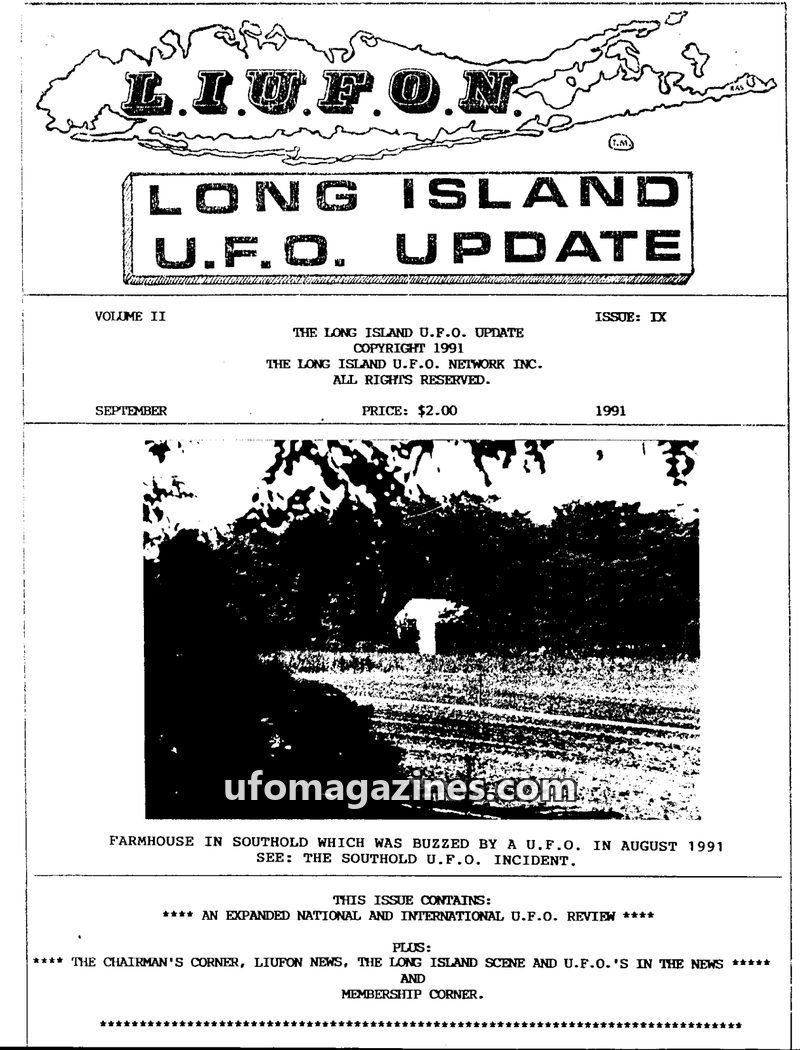 This September 1991 issue of the Long Island UFO Update details a busy month for LIUFON, with increased reports of sightings. It covers the Southold UFO Incident involving a farmho